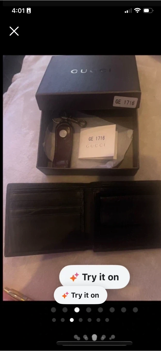 A black leather bi-fold wallet from Gucci. Made in Italy. It has multiple card slots.