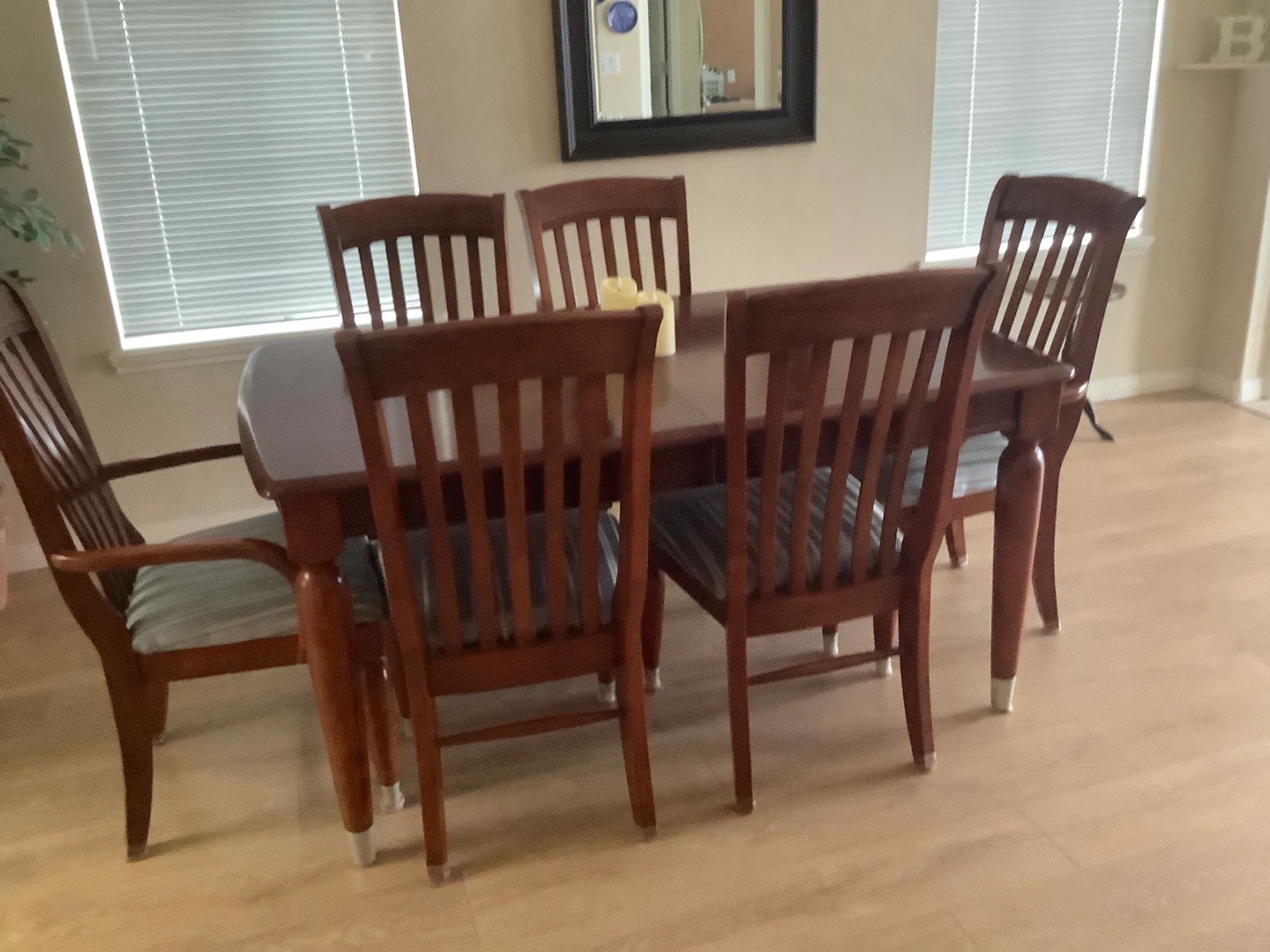 Buy & SellWooden Dining Table and Chairs SetWooden Dining Table and Chairs Set$268Wooden dining set with six chairs. Chairs feature slatted backs and upholstered seats. Table has a rich wood finish.WHERE TO MEETCheck LocationView MapSELLERBevSurrey BC100 reviews2 chats·1 favorites·60 viewsSEND CHAT TO SELLERHi Bev! I’m interested in your listing.Hi Bev! I’m interested in your listing.Get the Karrot app to chatSign In to chat