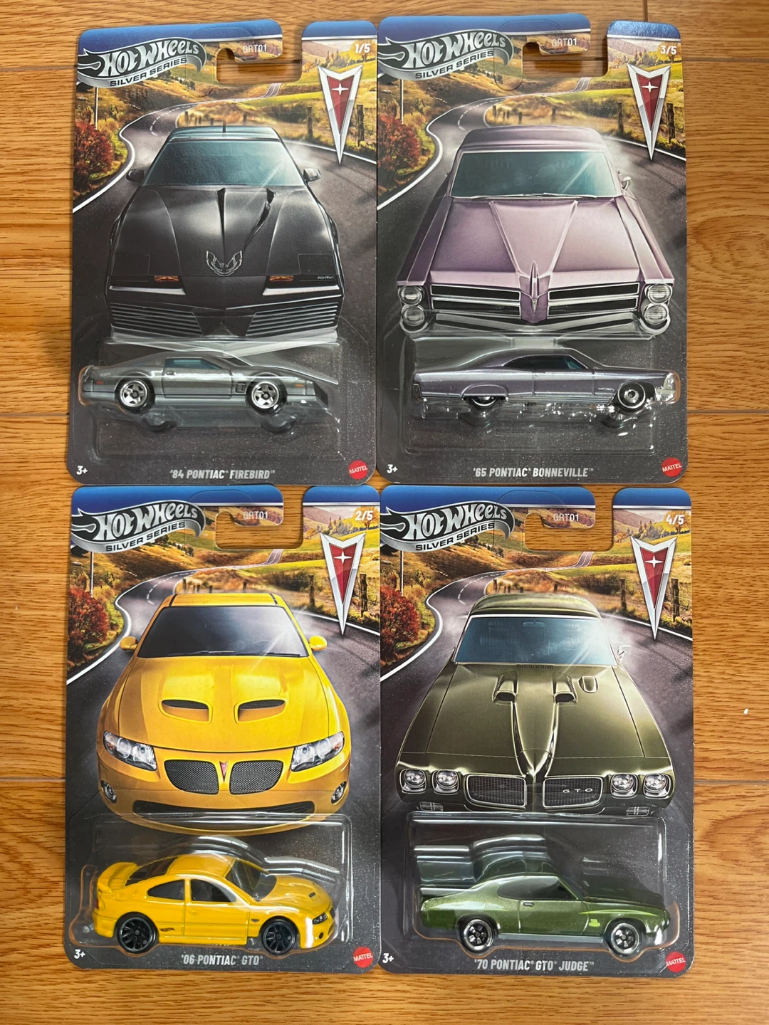Four Hot Wheels Silver Series die-cast cars featuring classic Pontiac models. Includes the '84 Pontiac Firebird, '65 Pontiac Bonneville, '06 Pontiac GTO, and '70 Pontiac GTO Judge. All are new in original packaging.