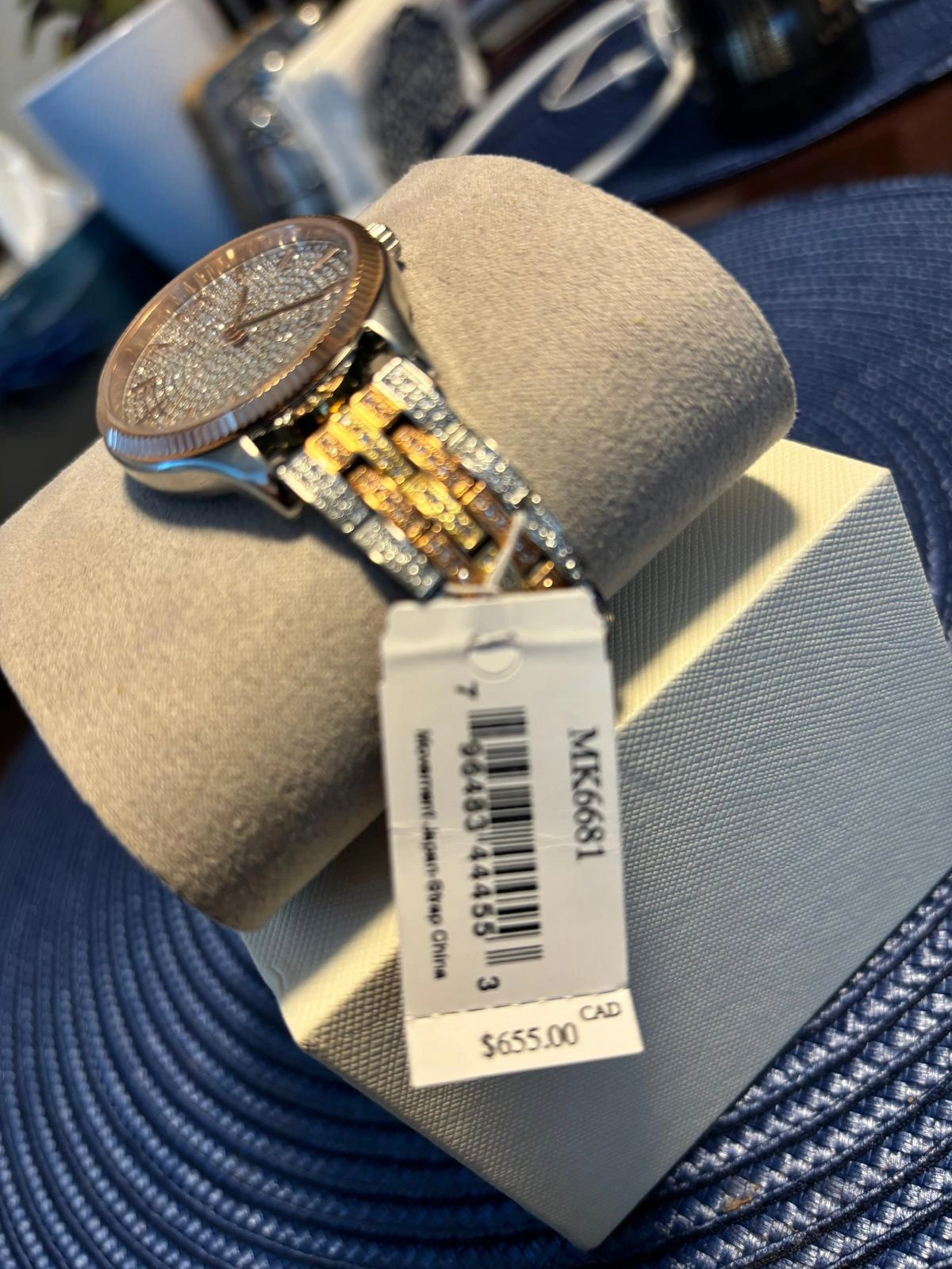 This is a Michael Kors women's watch with a rose gold face and crystal accents. The band is a mix of silver, rose gold, and gold. It is in a brand new condition.