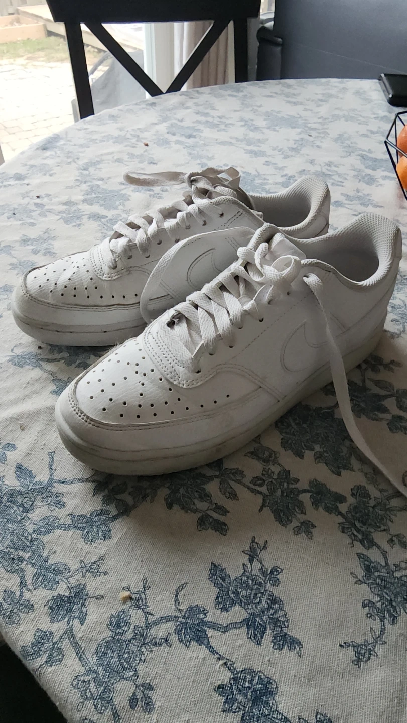 White leather Nike Court Vision Low sneakers for men. US size 8 (EUR 39, UK 5.5). Used as indoor shoes for my daughter. In great shape barely broken in.