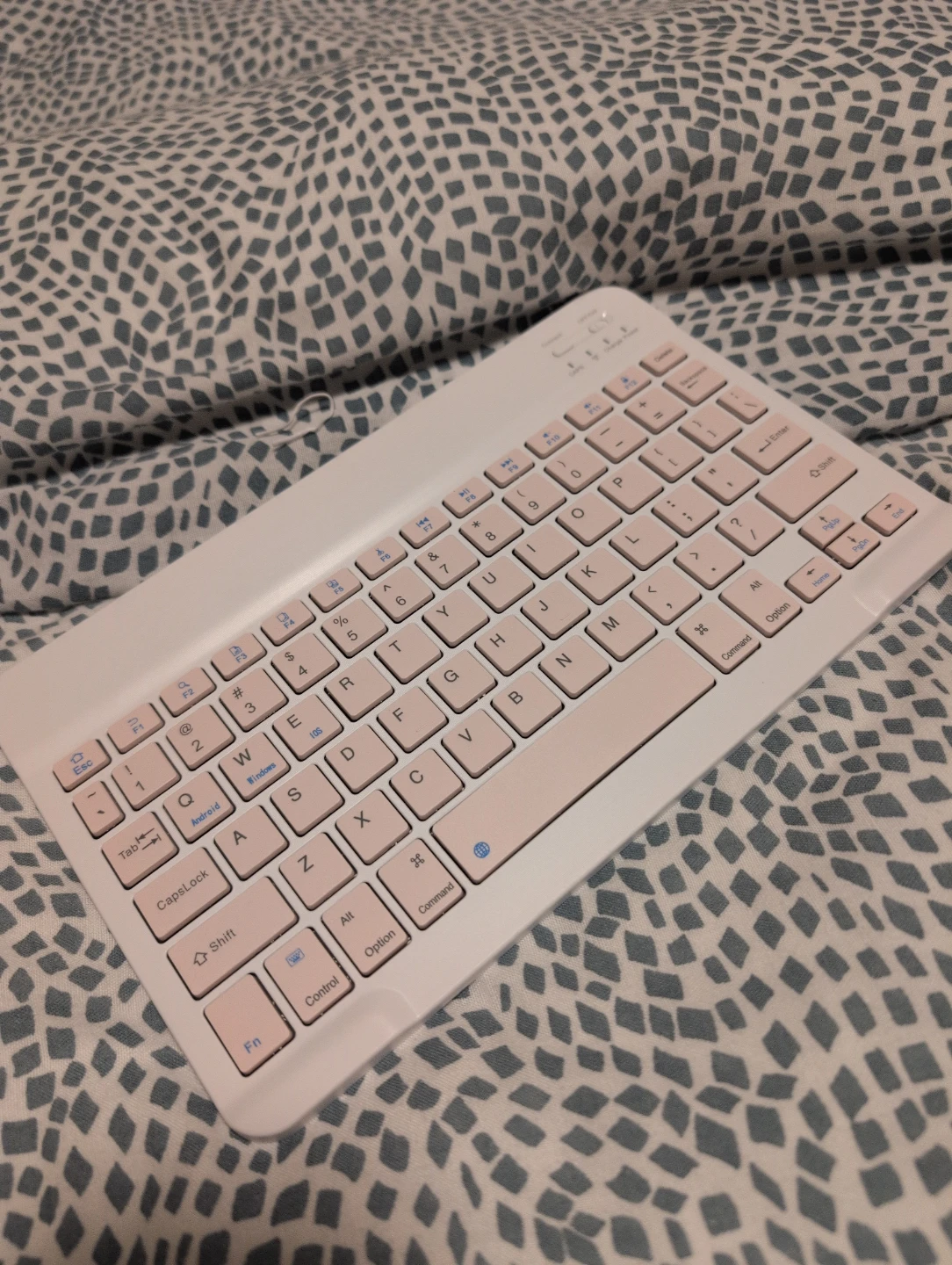 This is a white wireless Bluetooth keyboard. It's compact and designed for multiple devices. It has a clean white finish with light pink keys. USB-C chargeable.