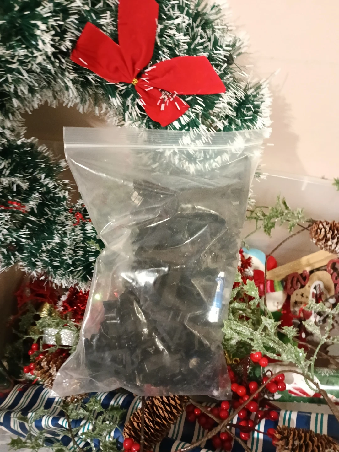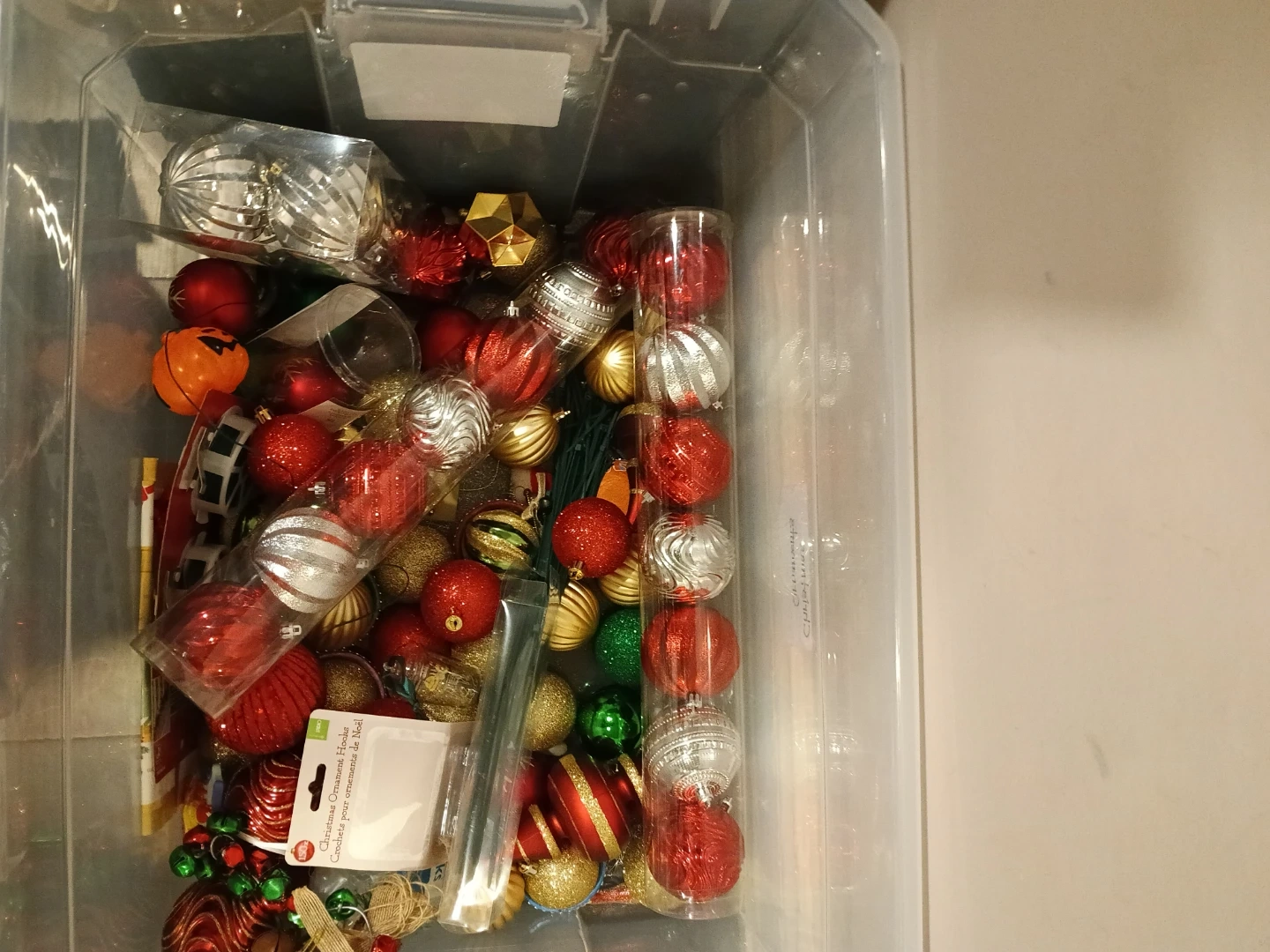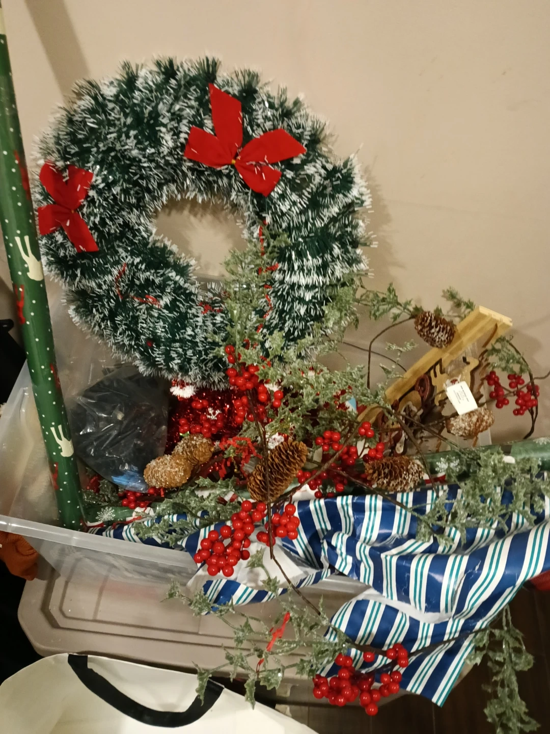 This lot includes a variety of Christmas decorations. You'll find a fluffy wreath with red bows, a wooden Santa sleigh with reindeer, and plush snowmen holding a 'Ho Ho Ho' sign. Also includes a bag of black hanging clips and a bin of assorted baubles in red, gold, and silver.