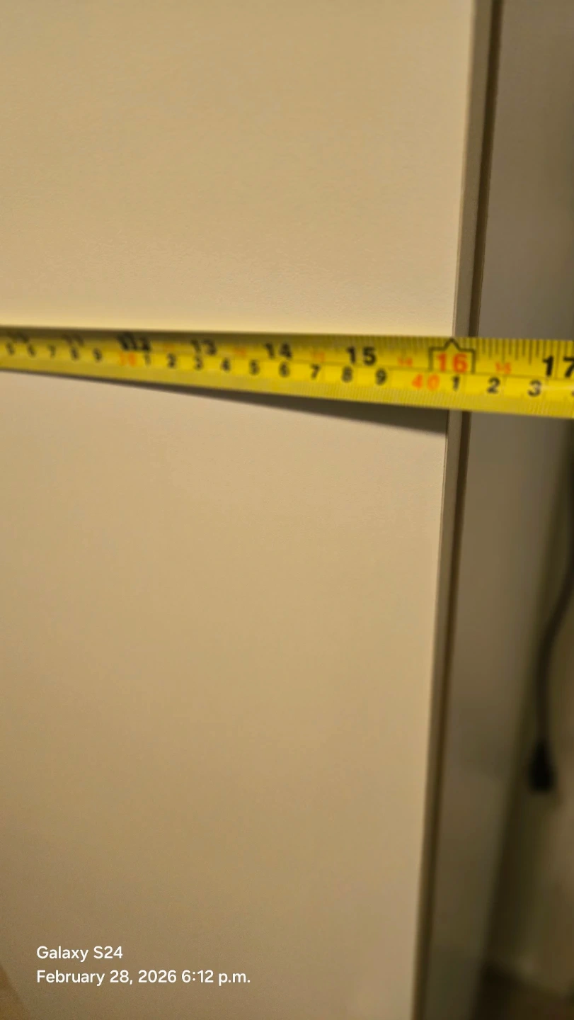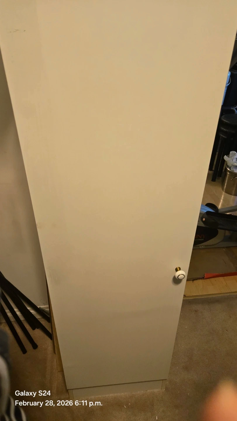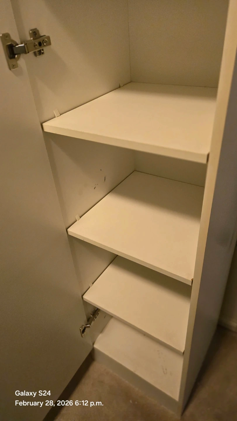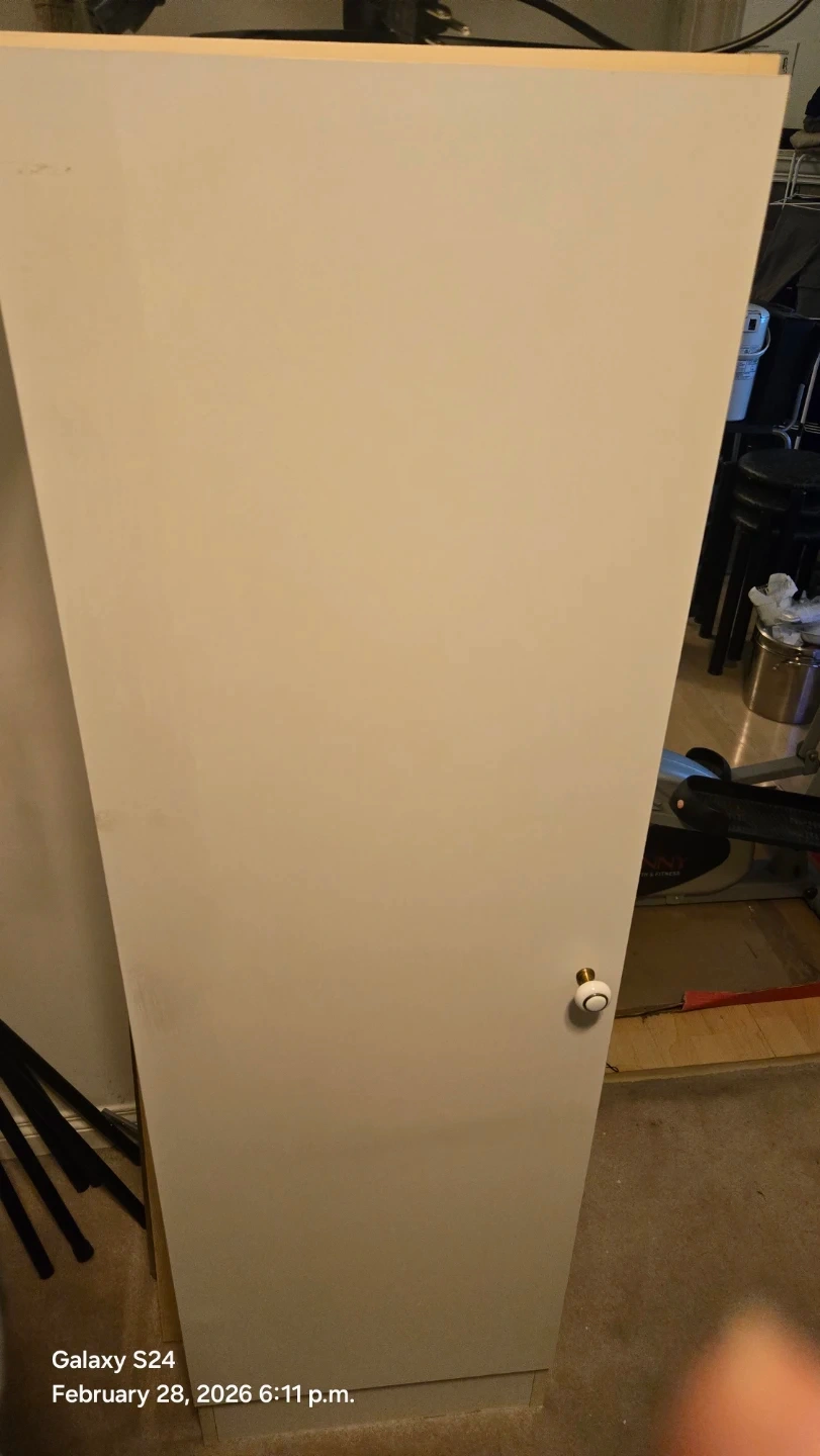 A white storage cabinet with multiple shelves inside. It has a simple door with a small knob for opening. Plenty of space for organizing your belongings!