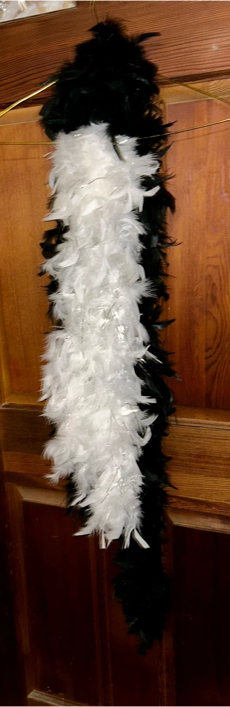A striking feather boa in pitch black and another feather boa that is white accented with silver tinsel. Soft feathers are perfect for costumes or festive occasions. Adds a touch of glamour to any outfit!