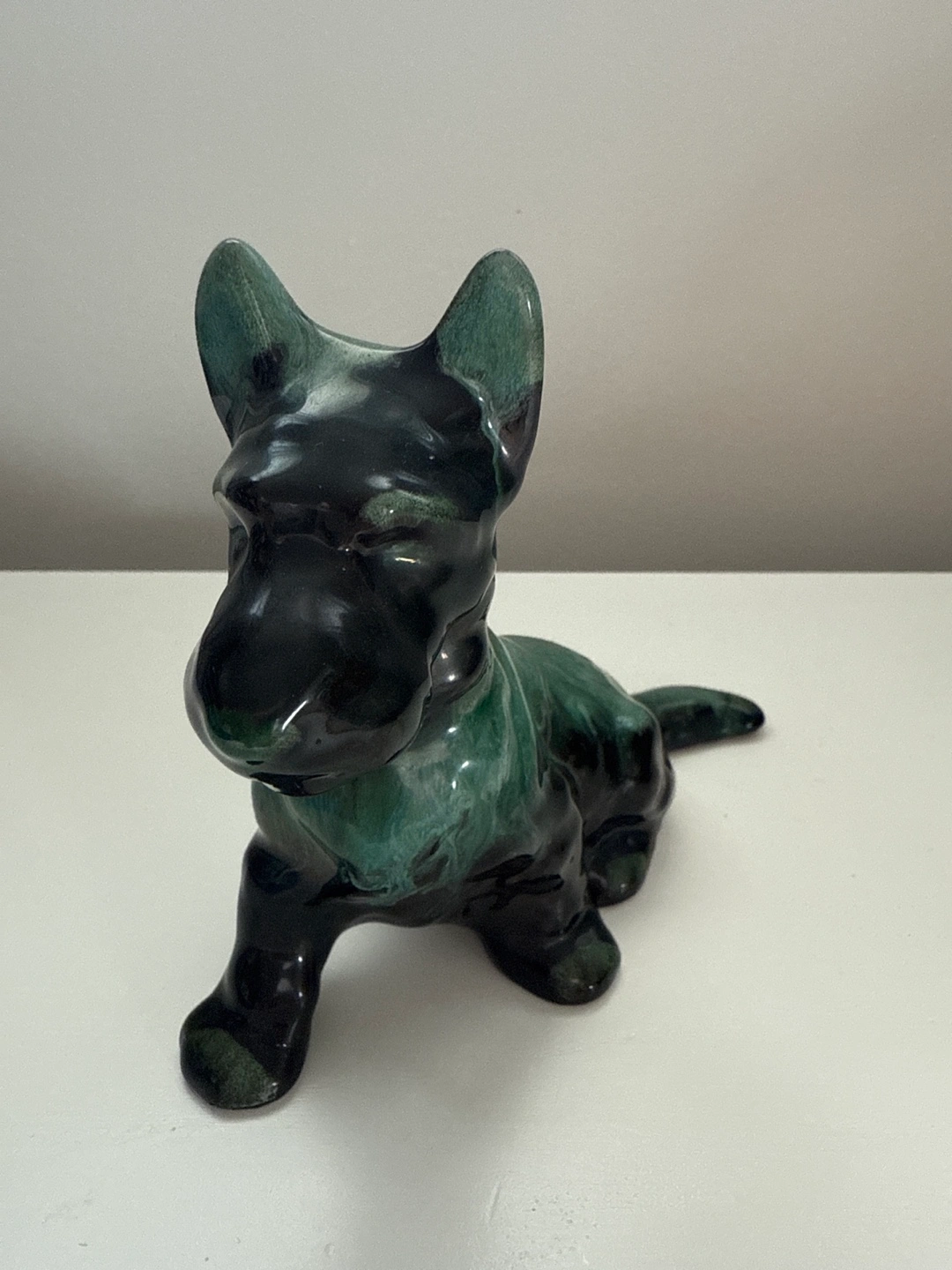 Blue Mountain Pottery, Scottie Dog Figurine, BMP Black and Green Drip Glaze, Mid Century Canadian Pottery Here's a cute green ceramic dog figurine! It's in great condition and would look great on a shelf or desk. It has a unique green glaze that gives it a lot of character
