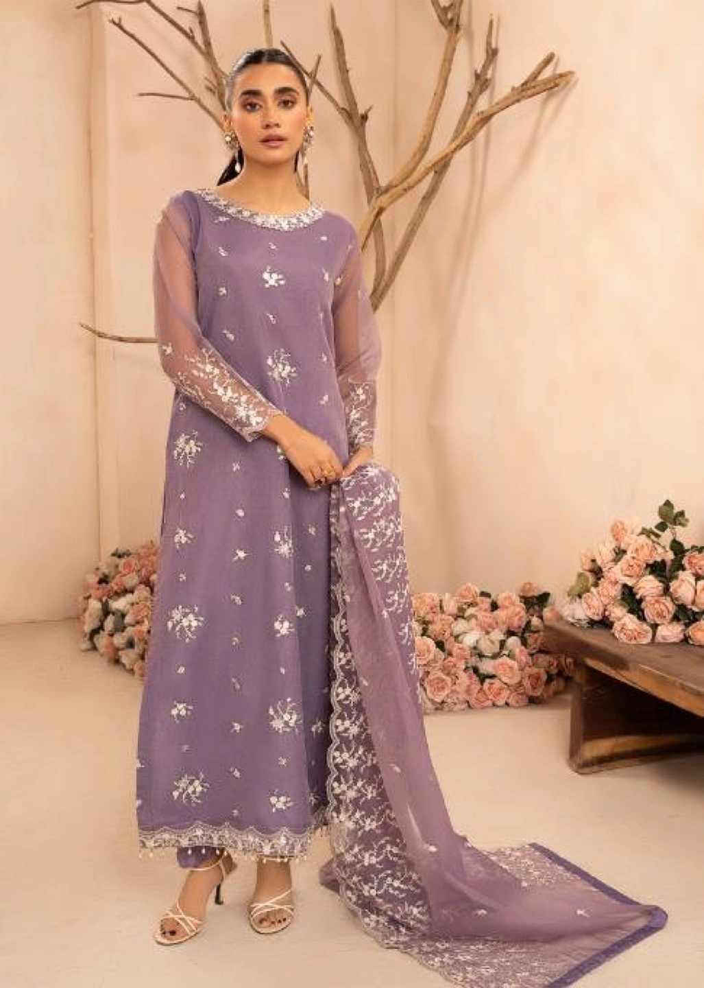 Beautiful lilac three-piece embroidered suit. Features a long shirt, trousers, and dupatta. Delicate floral embroidery throughout. Lightweight fabric, perfect for warmer weather.