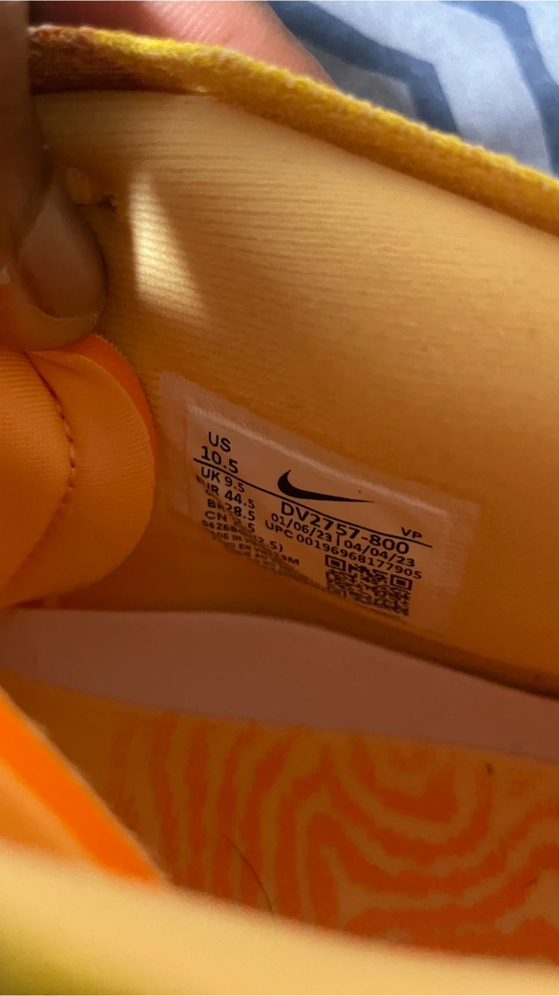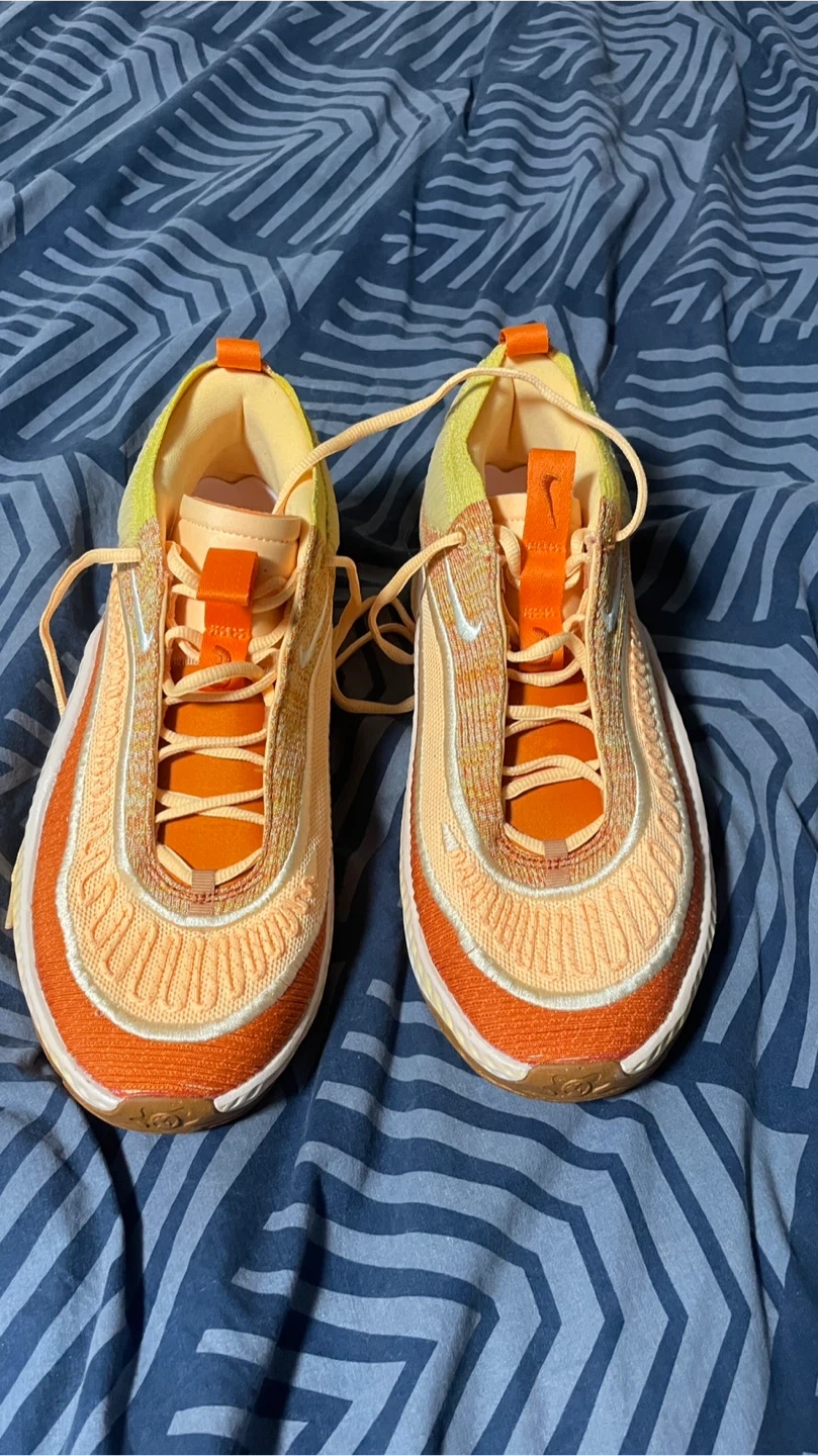 These Nike basketball shoes are a size 10.5. They feature a knit upper and a rubber outsole for traction. The bright orange and yellow colourway is eye-catching!