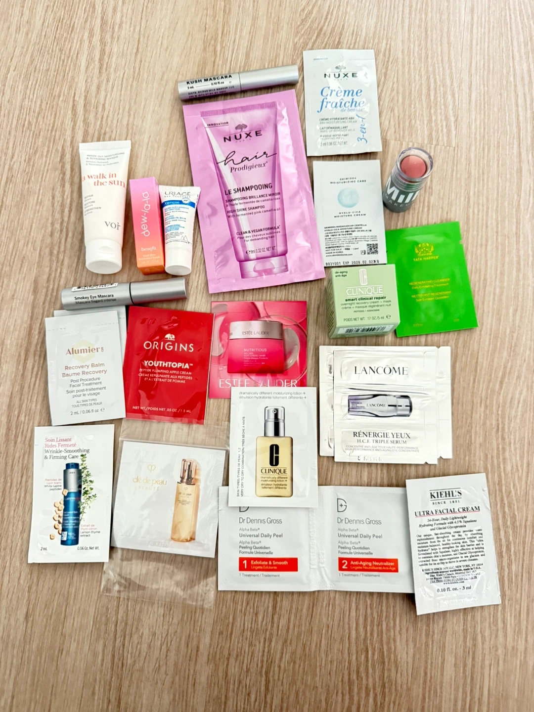 A collection of various skincare and beauty samples, including brands like Nuxe, Clinique, Estee Lauder, and Lancome. Perfect for trying out new products!