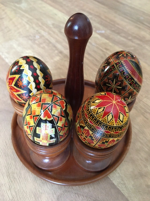 Enhance your Easter decor with these beautiful, hand-painted Ukrainian Easter eggs, known as Pysanky, displayed on a charming wooden egg holder! These eggs are meticulously decorated with traditional folk motifs, showcasing vibrant colours and intricate patterns, and the wooden stand adds a touch of rustic elegance to your spring celebrations. Please note that these are used and may have slight imperfections, which only add to their unique character. Hand-painted Pysanky eggs, traditional Ukrainian folk art, intricate and colourful designs, wooden egg holder included. Perfect for Easter decor or as a cultural keepsake. These festive eggs are priced at $50 to add a touch of folk artistry to your home. Cash accepted.