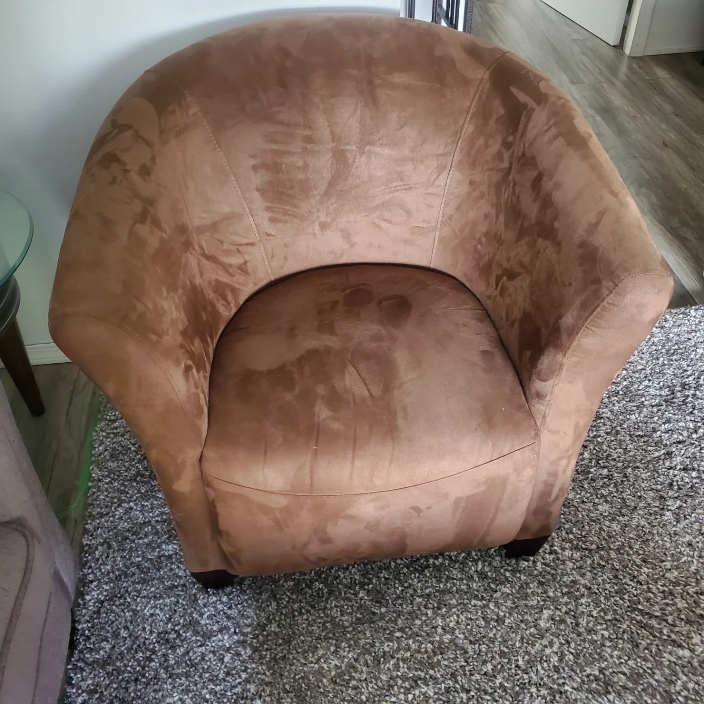 Comfortable accent chair with a plush, velvety feel. It's perfect for adding a cozy touch to any room. The chair has a curved back and armrests, offering a snug seating experience.