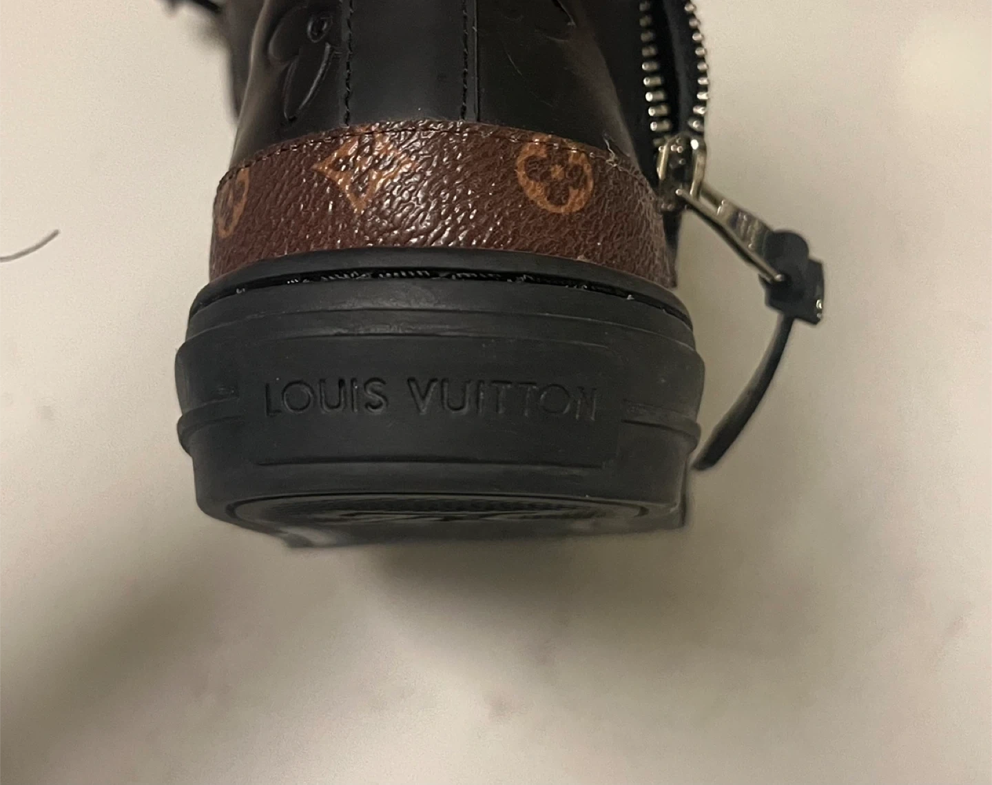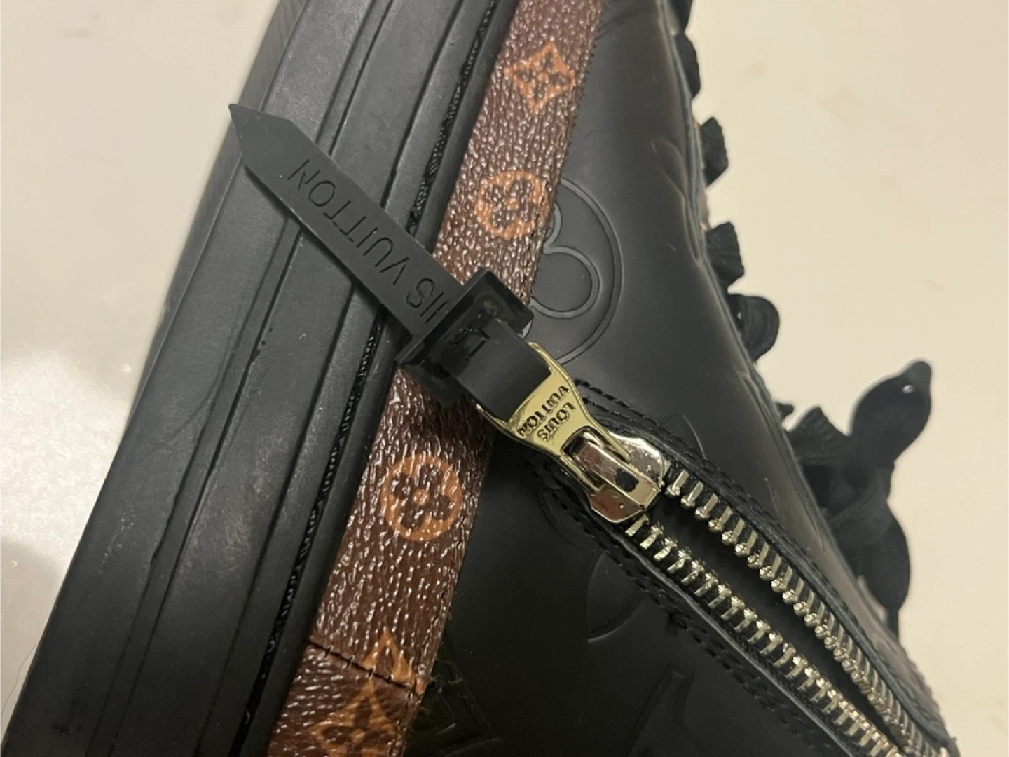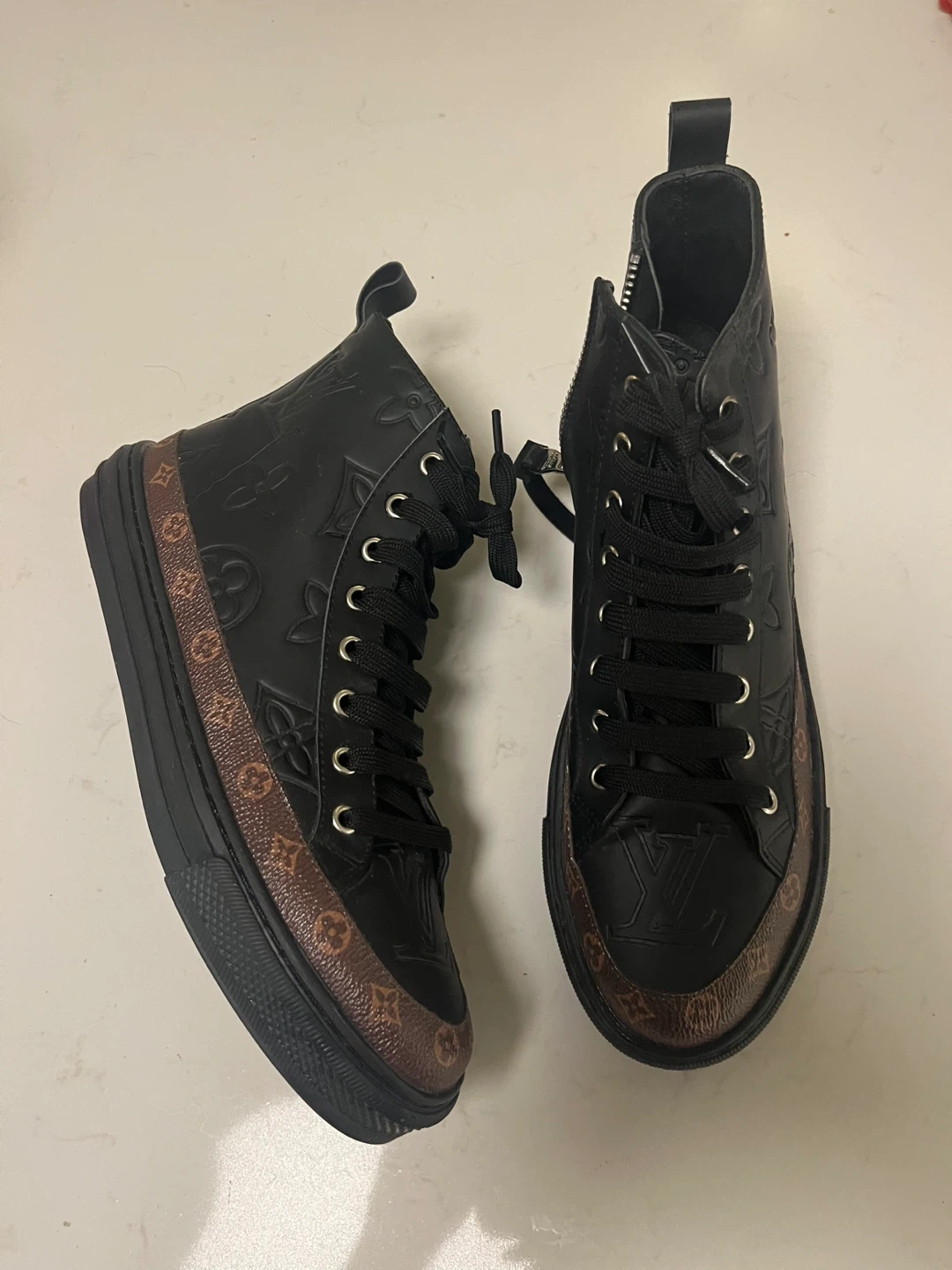 These high-top sneakers are black with embossed LV monogram all over the leather. They feature a brown monogram canvas detail around the sole and a side zipper closure. Made in Italy.