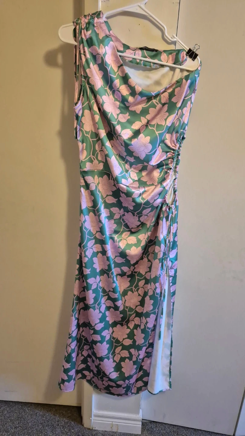 Here's a fun and stylish one-shoulder dress with a green and pink floral pattern! It has a side slit and a gathered detail on one side. Perfect for a summer outing or a night out or a wedding guest.