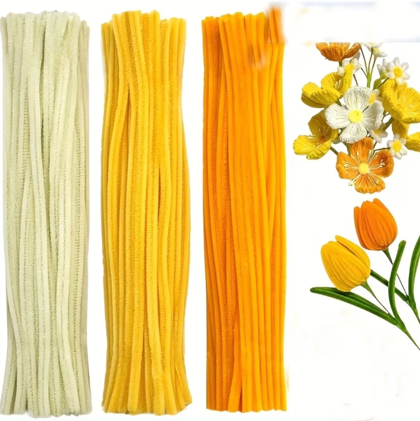 This set includes pipe cleaners in yellow, orange, and a cream or pale yellow colour. Great if you want to start your pipe cleaner flower journey!