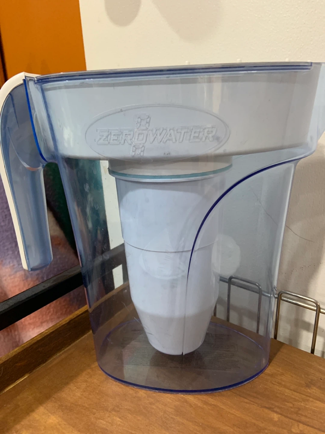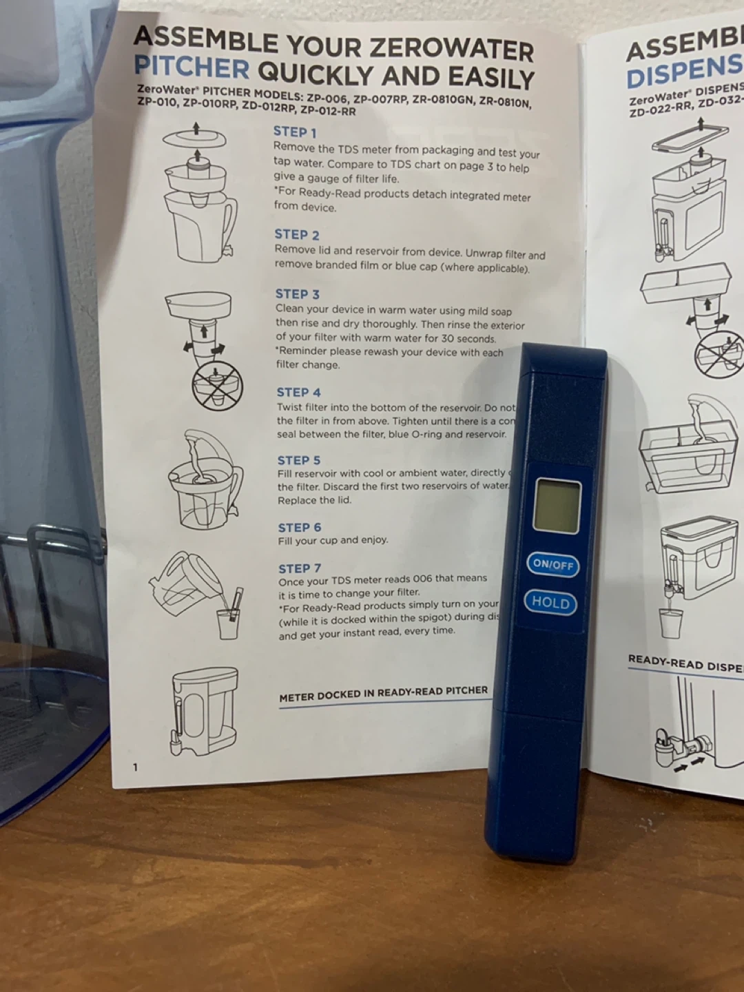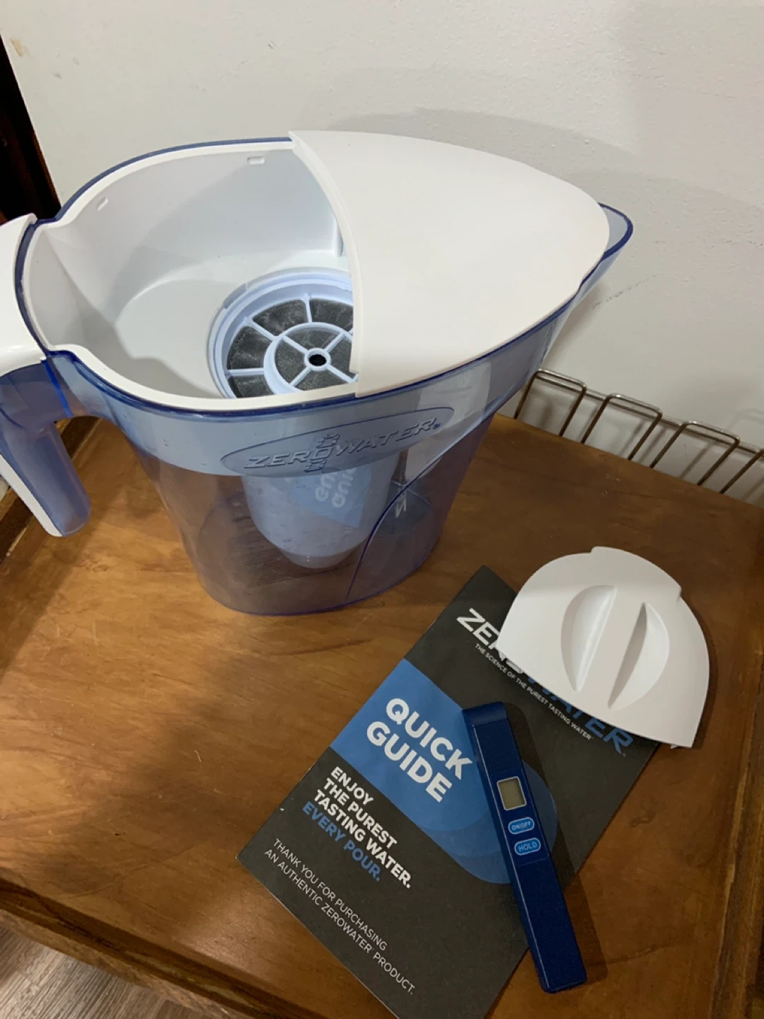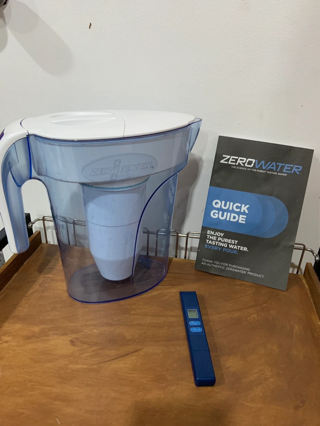 This is a ZeroWater pitcher with a TDS meter. It's designed for filtering tap water to provide pure-tasting water. The pitcher includes a filter and a quick guide.
