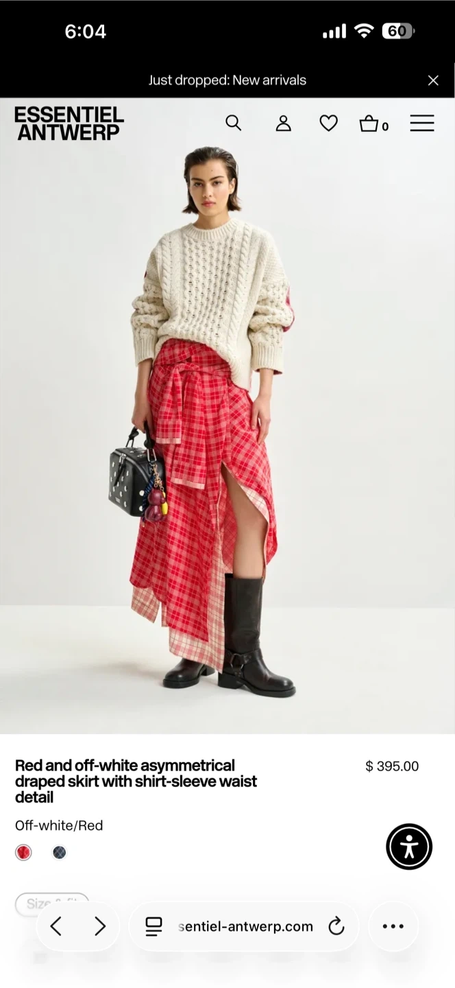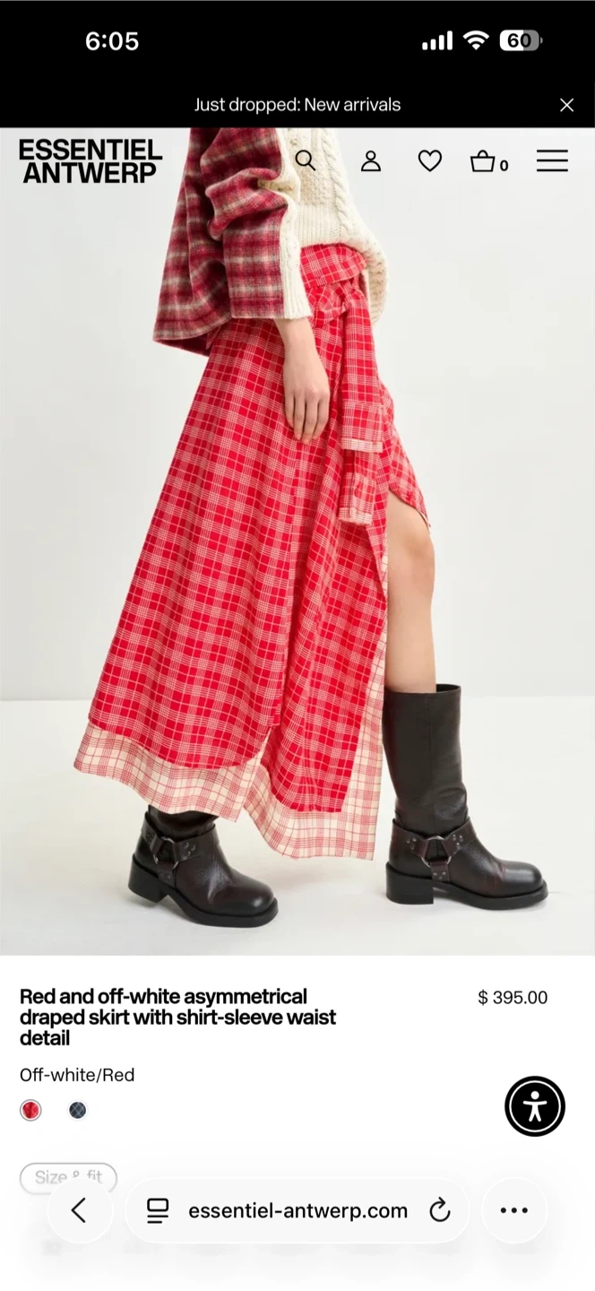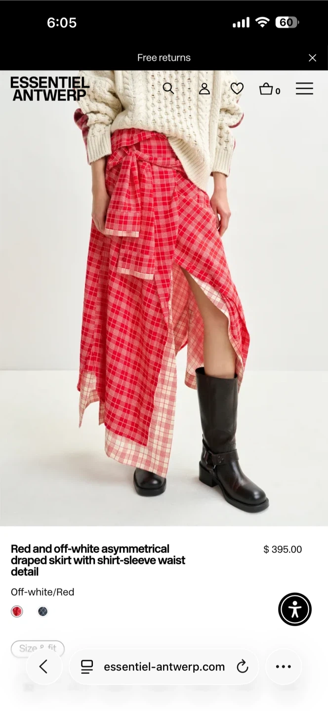 This Essentiel Antwerp skirt features a red and off-white asymmetrical plaid design. It has a draped silhouette and a shirt-sleeve waist detail. Polyester and viscose blend. I buy for 395 plus tax , I sell for 200. New