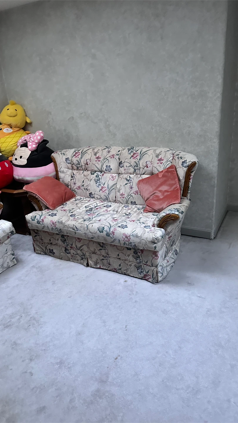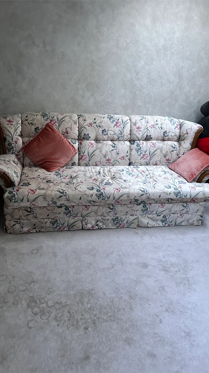 A lovely set featuring a floral-patterned loveseat and an armchair. Both pieces have a classic design with wooden trim. Includes two blush pink accent pillows. This set adds a touch of vintage charm to any living space!