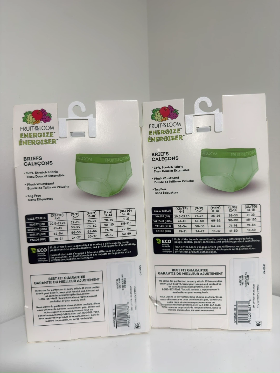 This is a 5-pack of Fruit of the Loom Energize boys' briefs. They're made with soft, stretch fabric for comfort. The briefs are size L/G, fitting waists 28-30 inches.