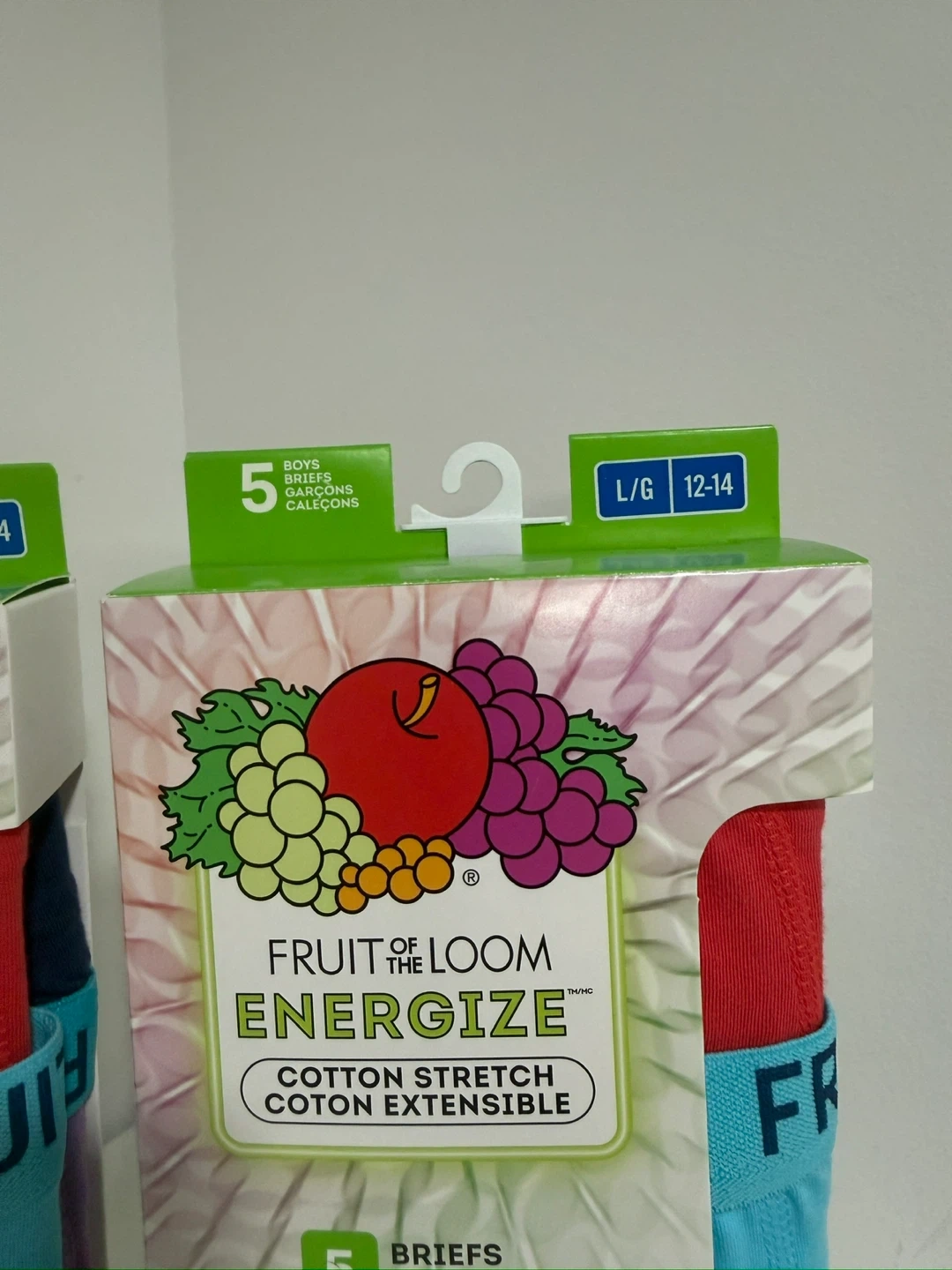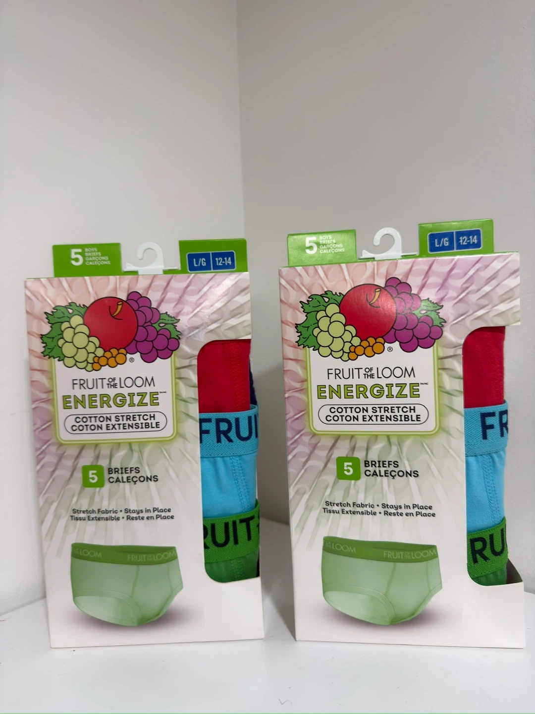 This is a 5-pack of Fruit of the Loom Energize boys' briefs. They're made with soft, stretch fabric for comfort. The briefs are size L/G, fitting waists 28-30 inches.