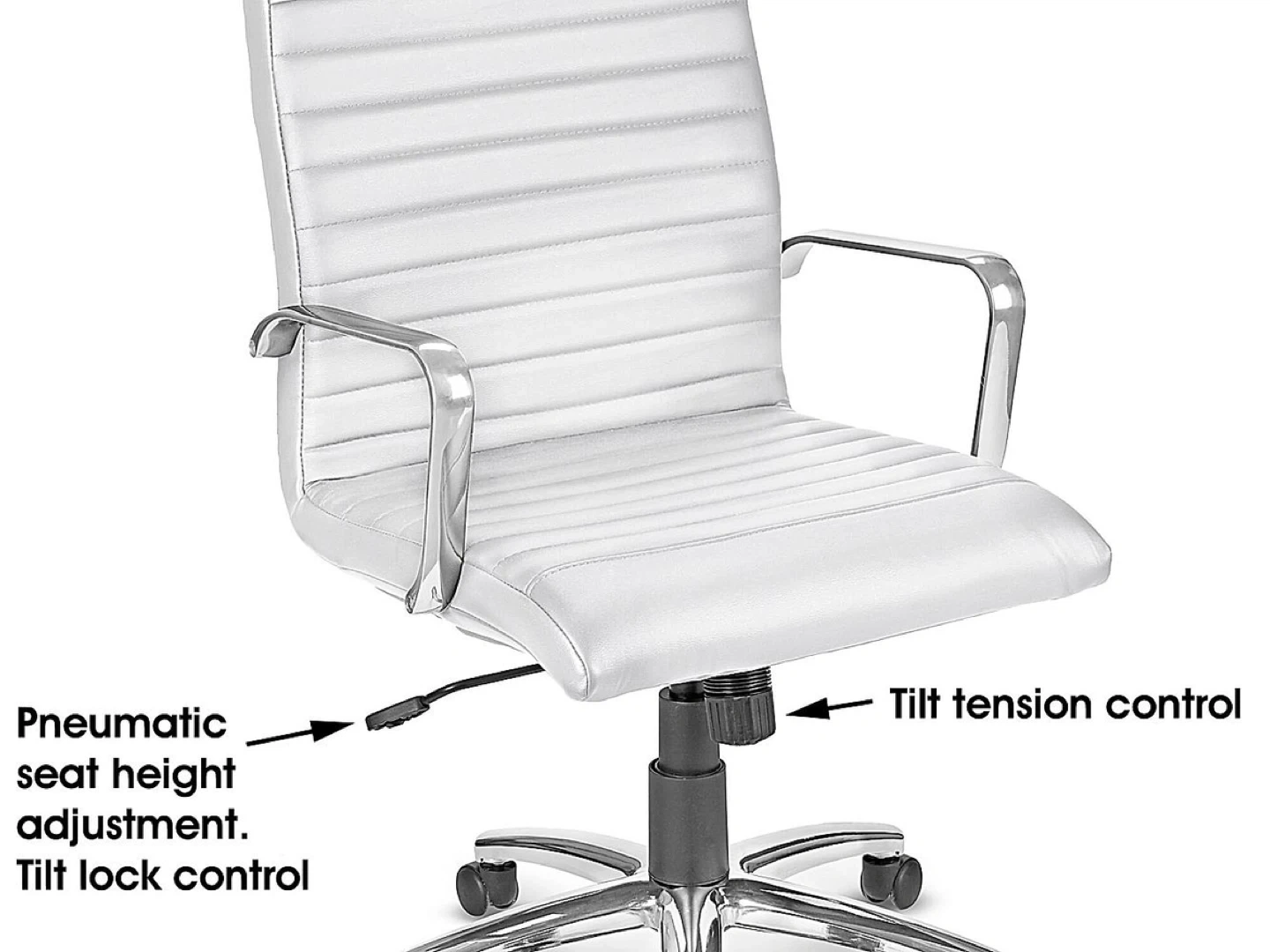 This office chair features a white faux leather seat and back with horizontal tufting. It has chrome finished armrests and a five-star base with casters for mobility. The chair offers pneumatic seat height adjustment and tilt tension control. It's a comfortable option for any home office or workspace.