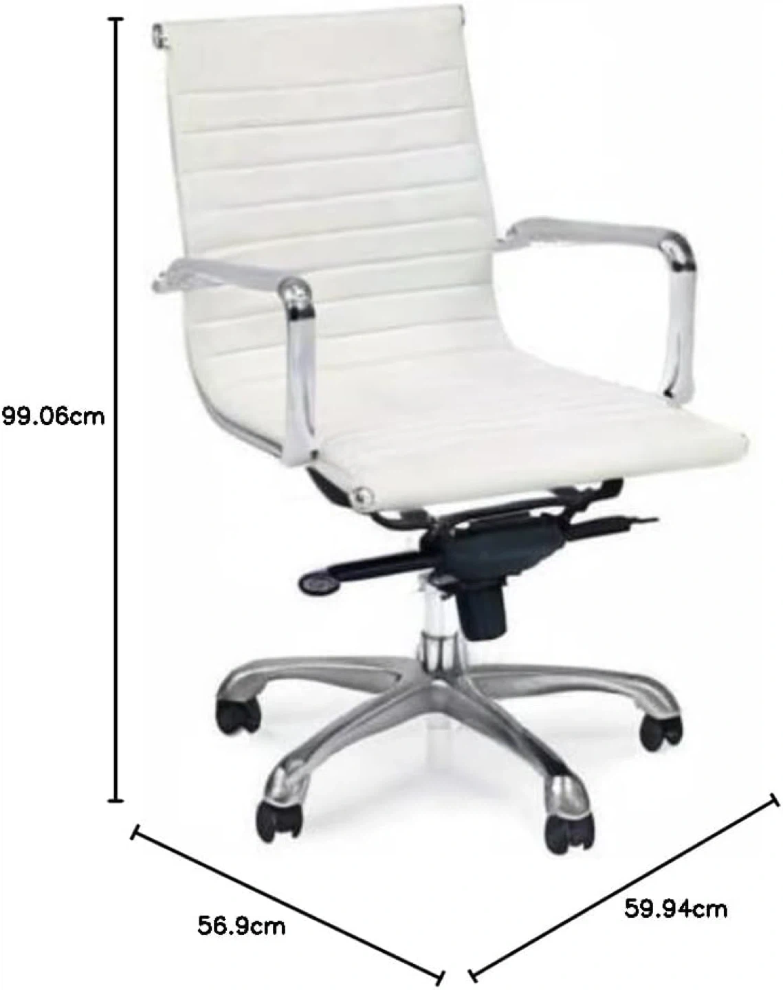 This office chair features a white faux leather seat and back with horizontal tufting. It has chrome finished armrests and a five-star base with casters for mobility. The chair offers pneumatic seat height adjustment and tilt tension control. It's a comfortable option for any home office or workspace.