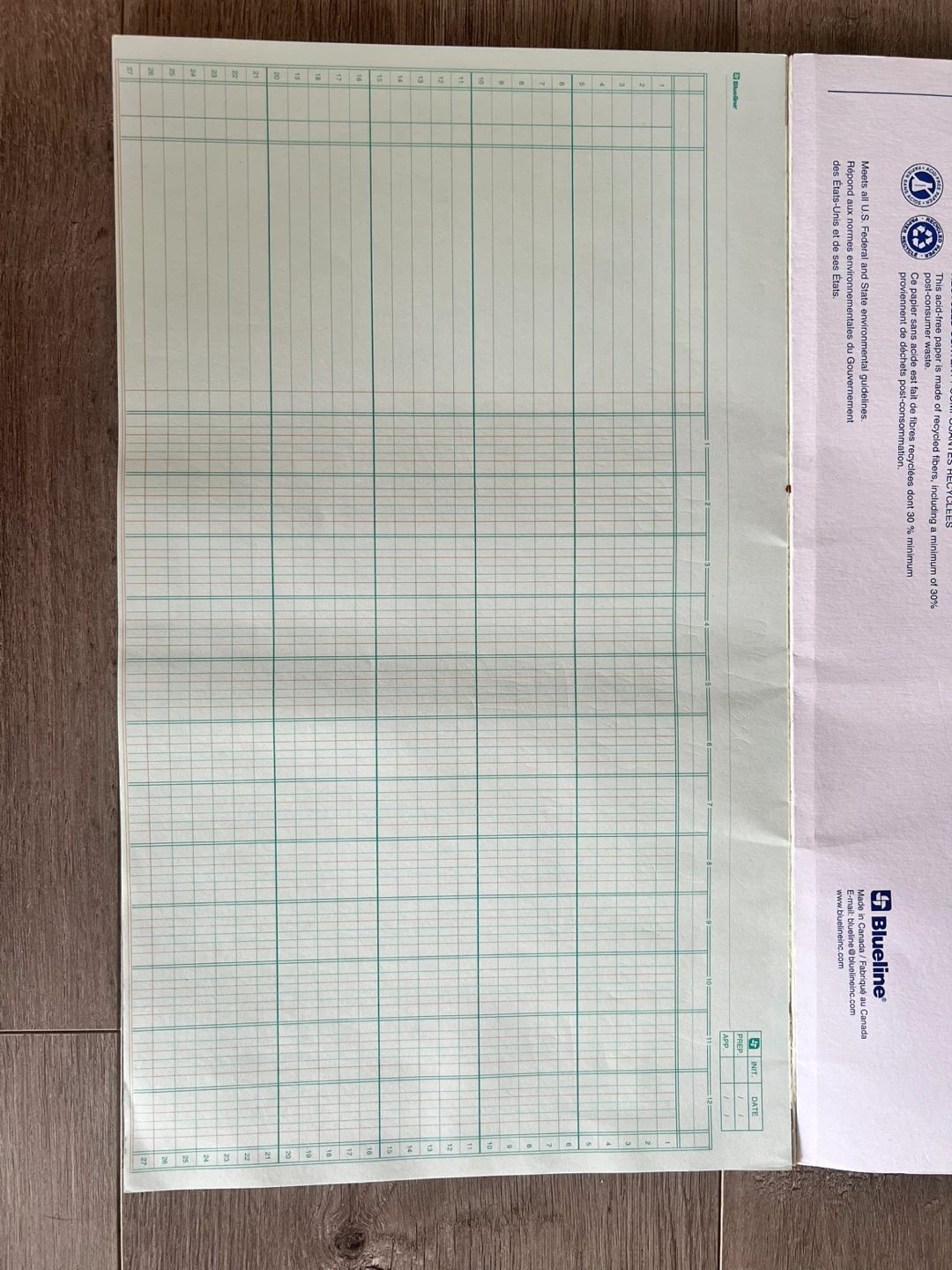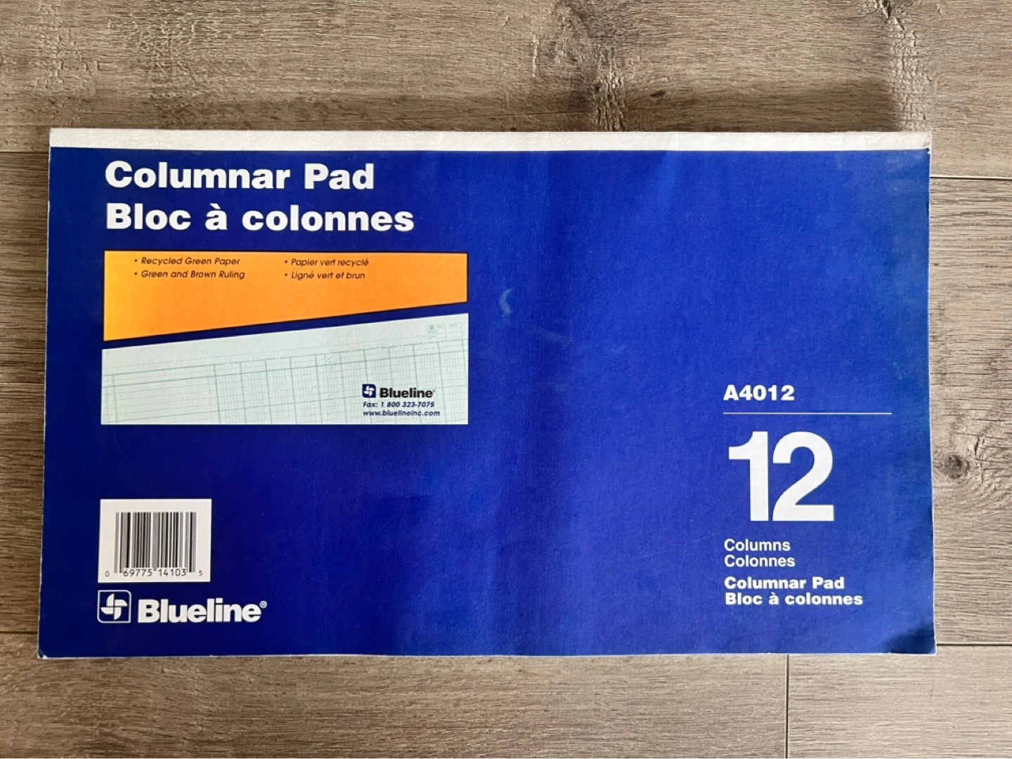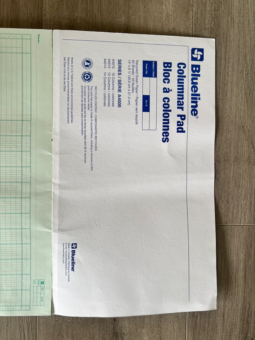 This is a Blueline A4012 columnar pad. It features 12 columns and recycled green paper with green and brown ruling. The pad measures 14 x 8 3/4 inches (35.5 cm x 22.3 cm).