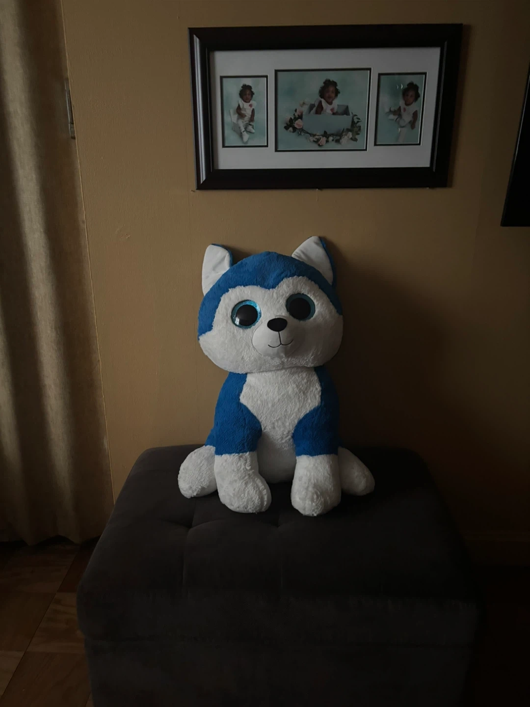 This listing includes a giant brown teddy bear and a blue and white husky plush toy. Both stuffed animals are soft and cuddly, perfect for decoration or play. The teddy bear has a red bow and pink nose. The husky has big blue eyes. Teddy bear is 5 feet tall and the husky is 3 feet tall…Both for $20