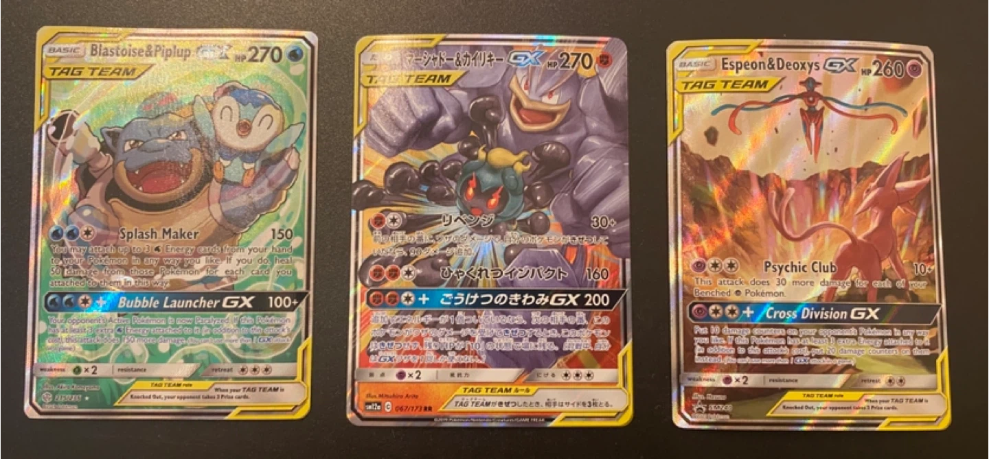 Three collectible Pokemon TAG TEAM GX cards are available. They include Blastoise & Piplup GX, Marshadow & Machamp GX, and Espeon & Deoxys GX. These are all holographic, high-HP cards from the Pokemon Trading Card Game.