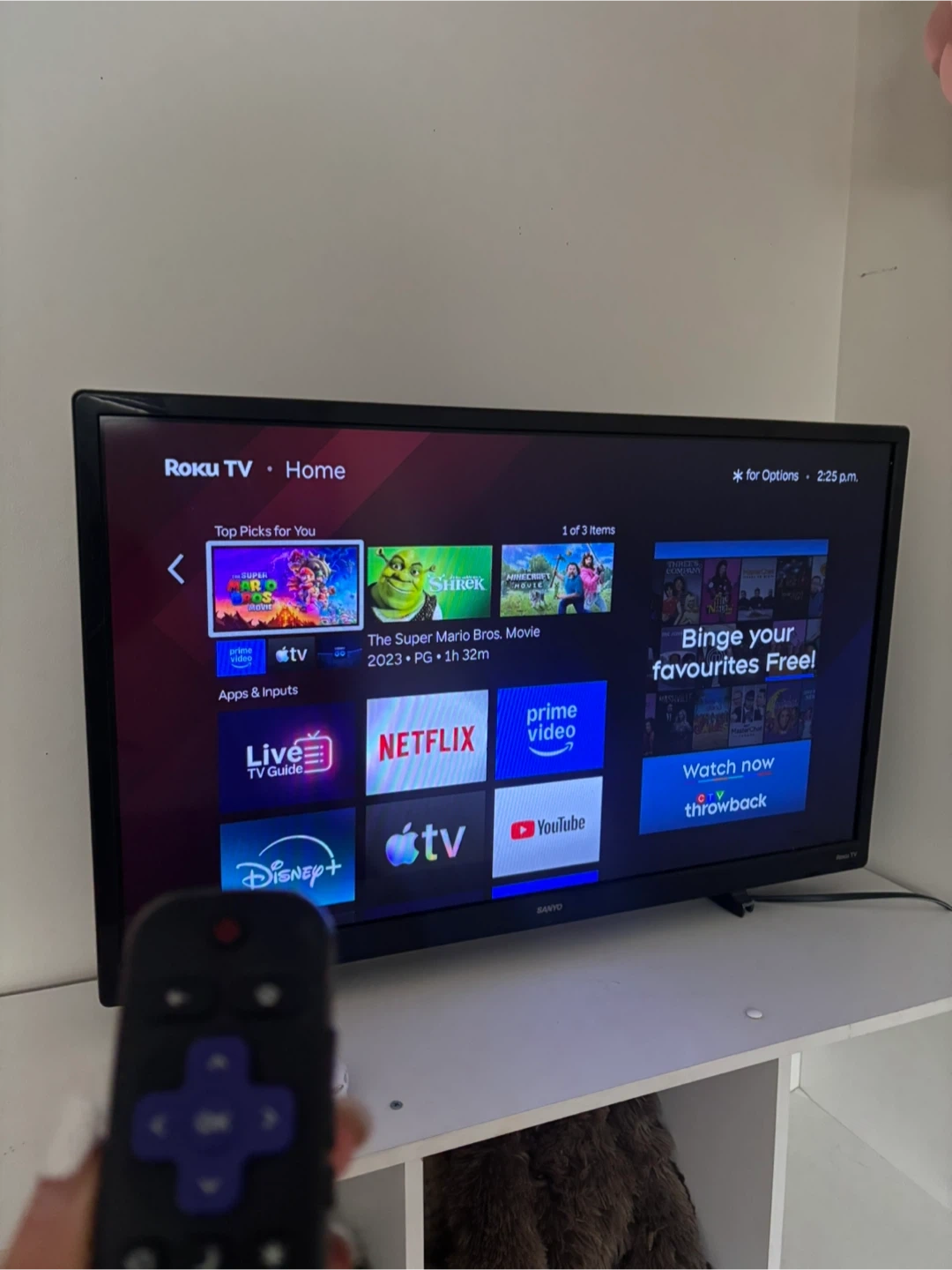Cute bedroom TV, need to sell because I’m moving. The foot is slightly broken, but it dosent interfere with the TVs centring. Besides that it’s in great shape.