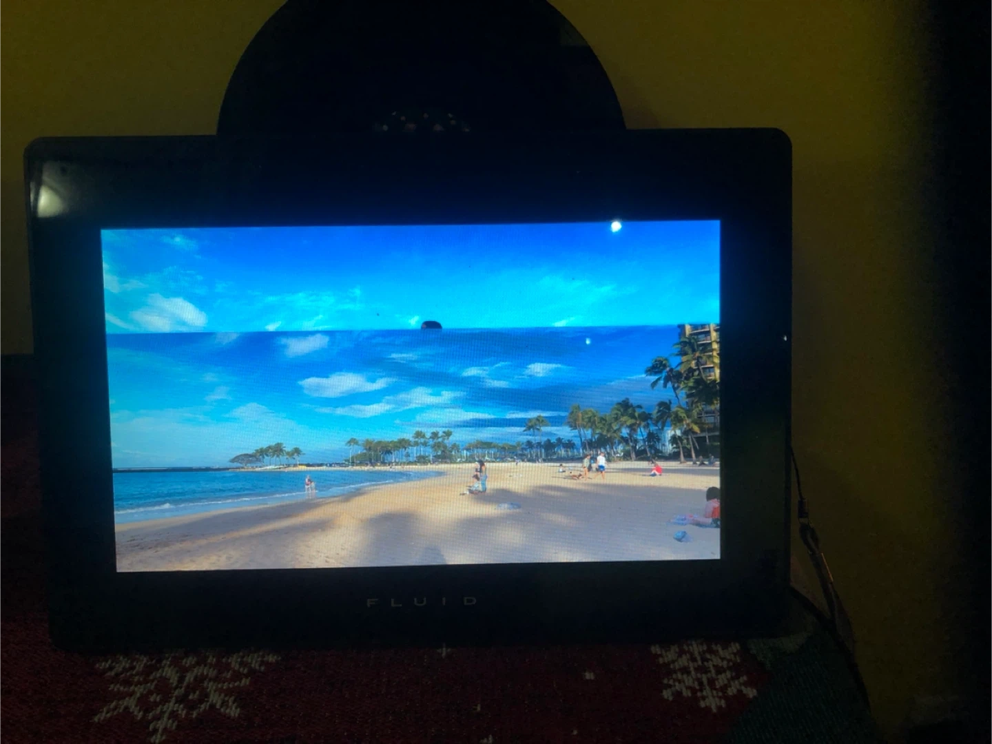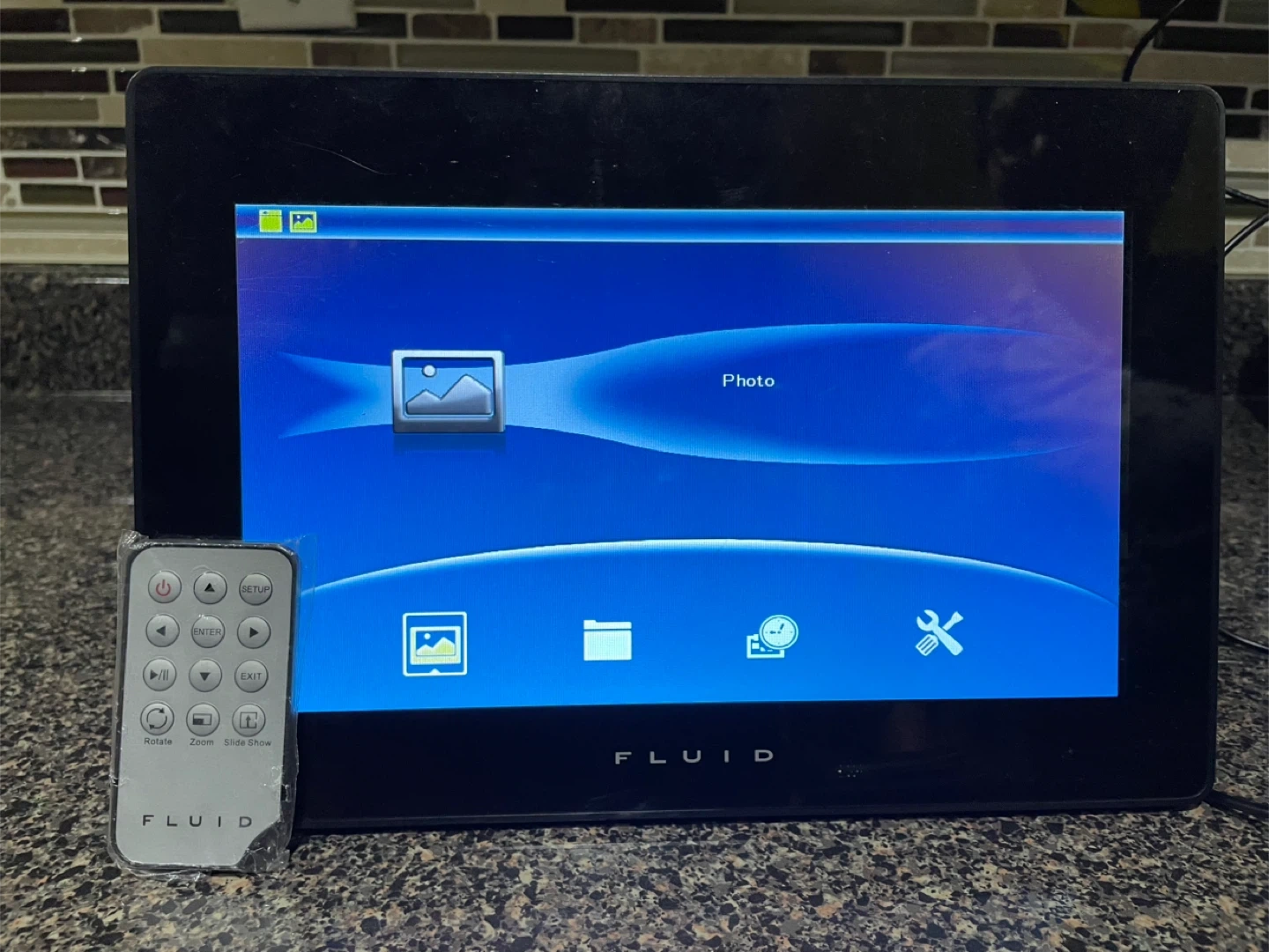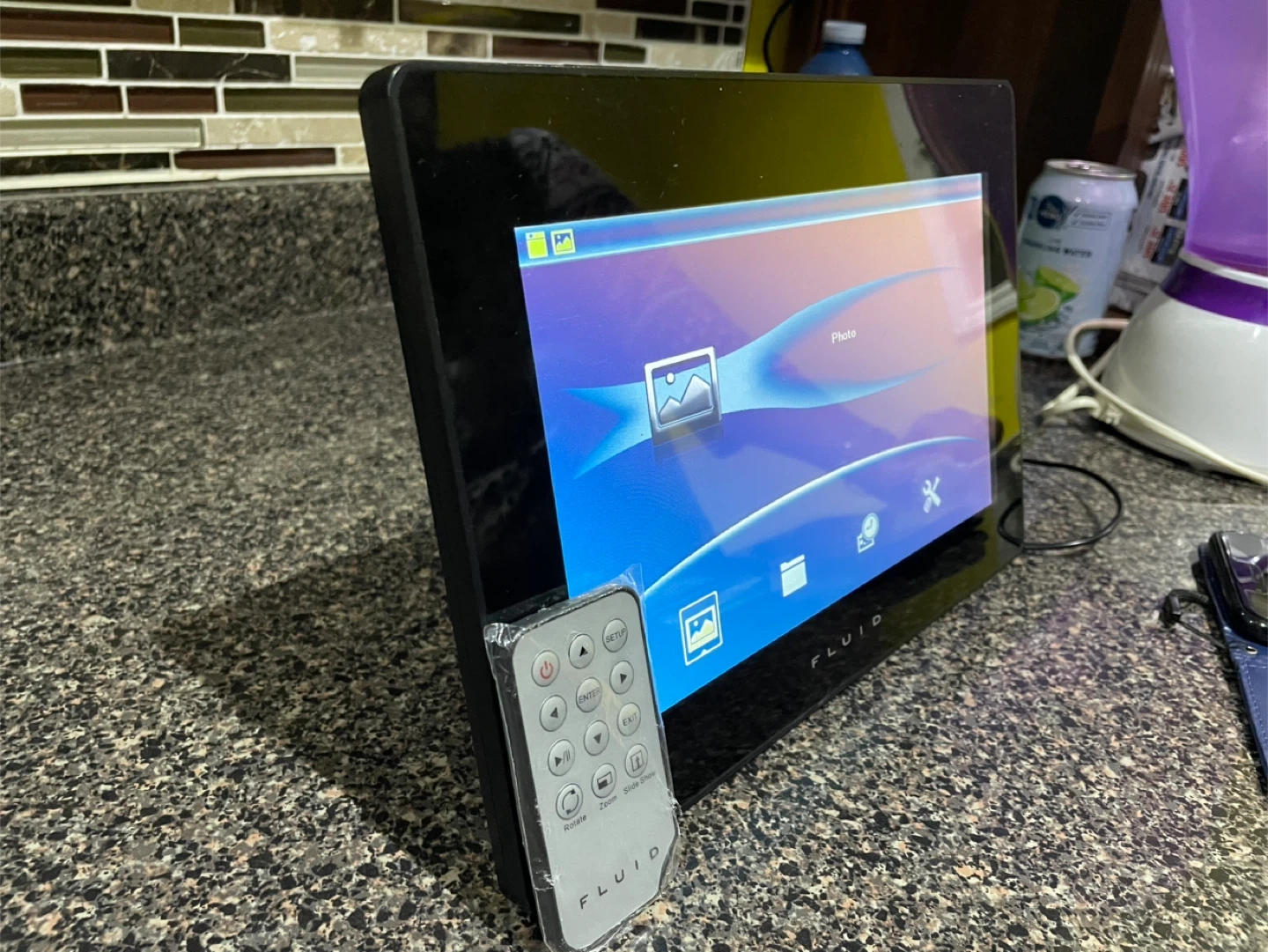 Fluid digital photo frame. It comes with a remote and charger so you can easily display your favourite photos. Great for sharing memories with family and friends.