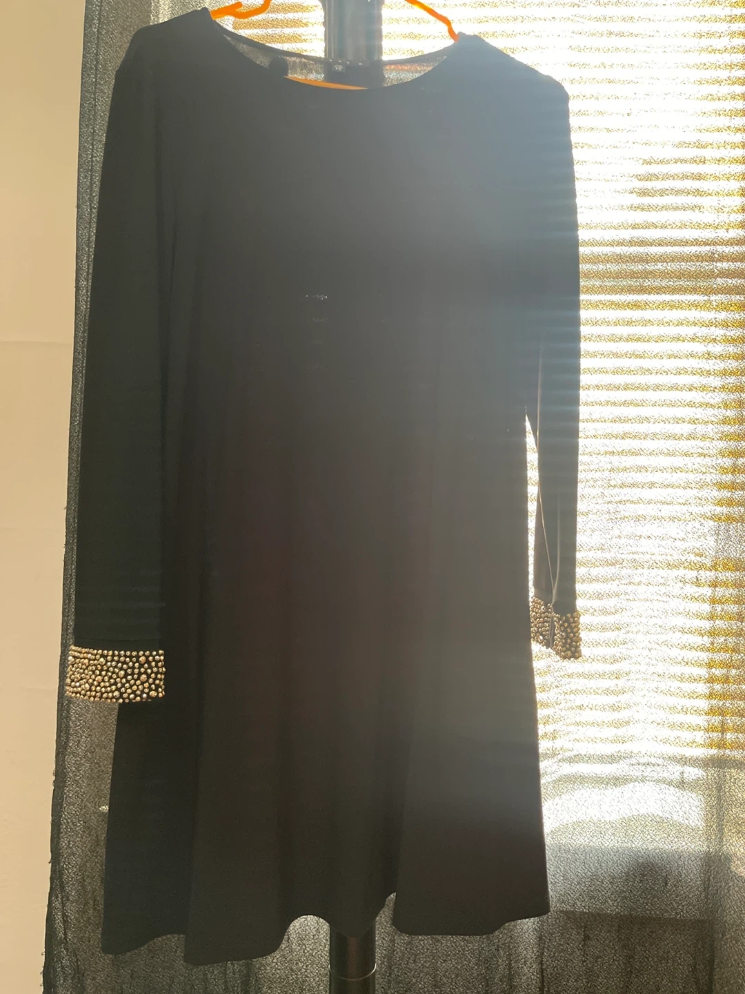 Black long sleeve dress featuring decorative bead embellishments on the cuffs. This dress has a classic crew neckline. It's made of a comfortable fabric blend.