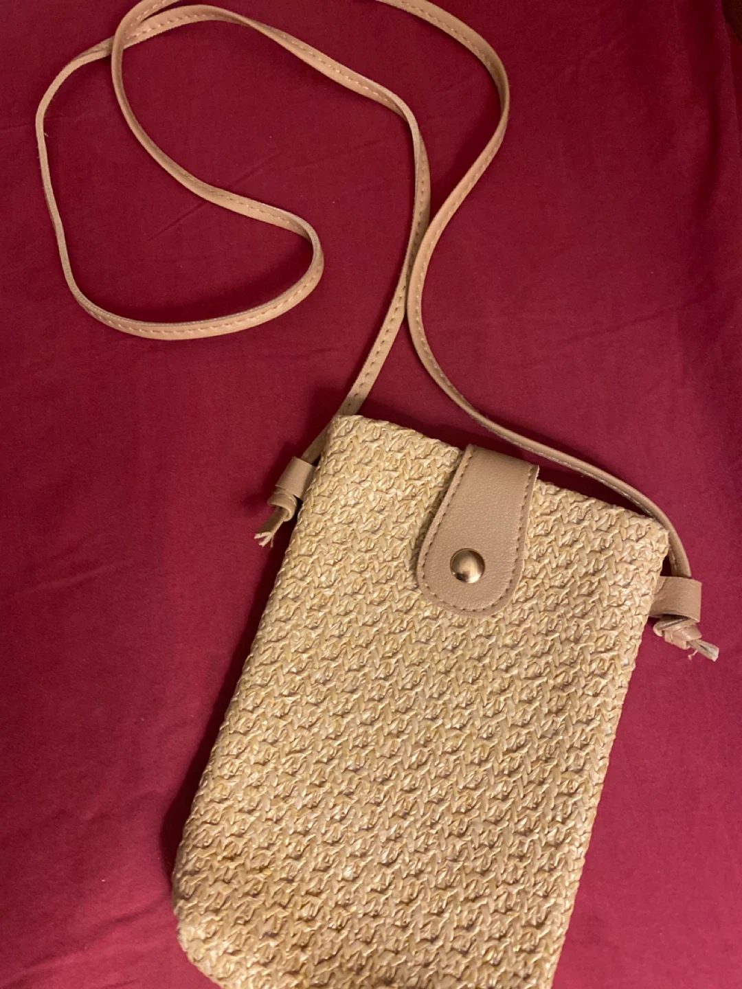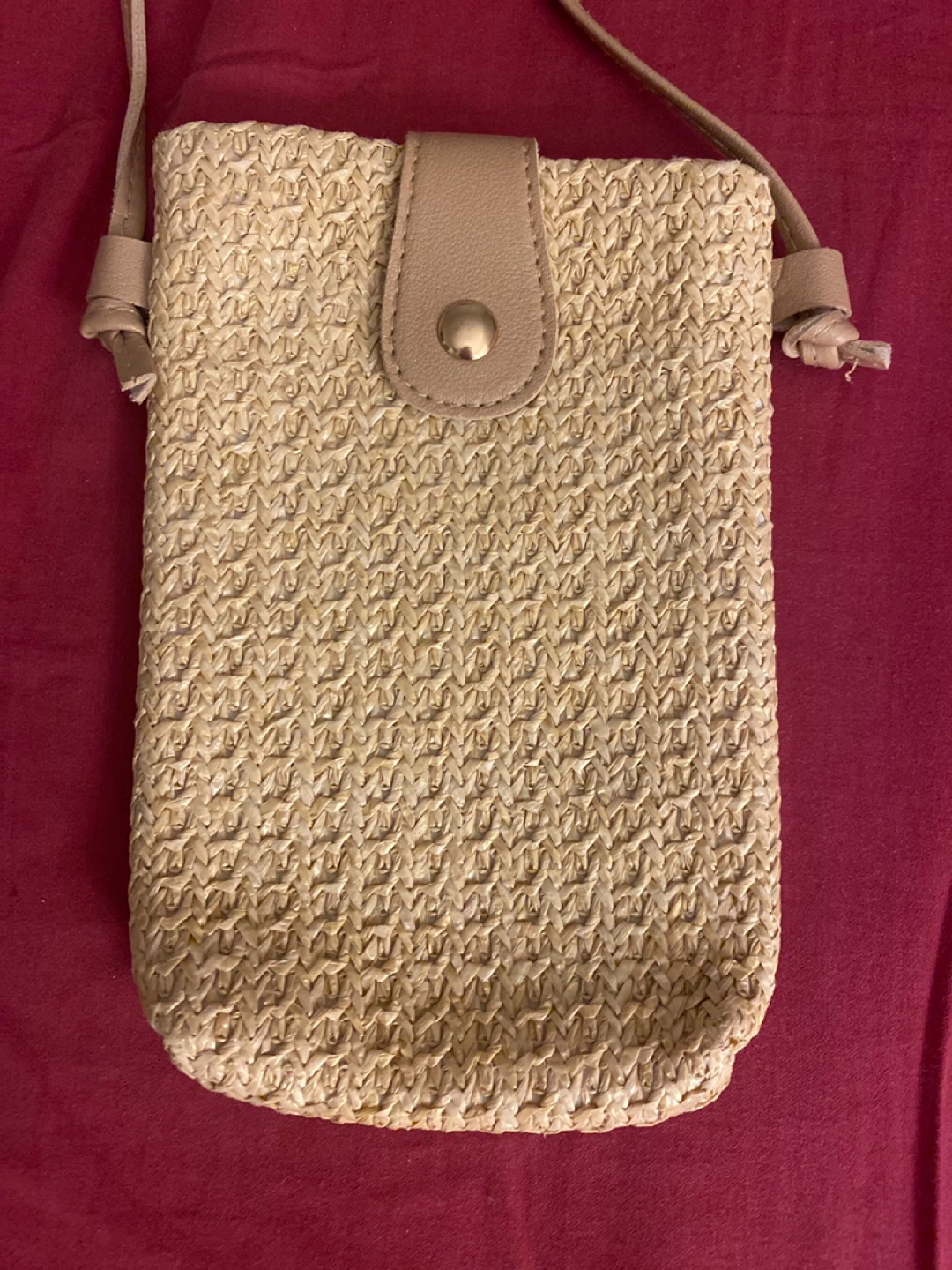 Straw crossbody phone bag with a tan faux leather accent. It has a snap closure and a long adjustable strap. Perfect for keeping your phone handy on the go!
