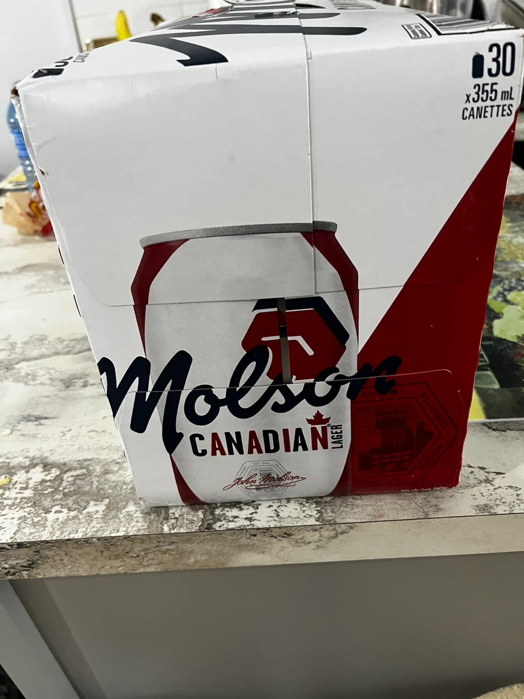This is a case of 30 Molson Canadian Lager beer cans. Each can contains 355 ml of beer. The alcohol content is 5% by volume. It's a classic Canadian lager.