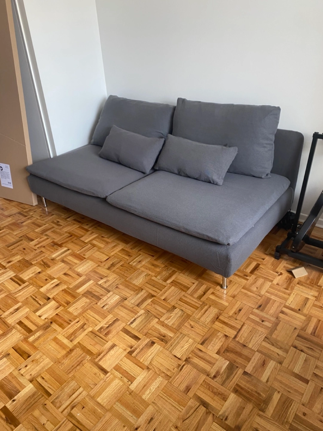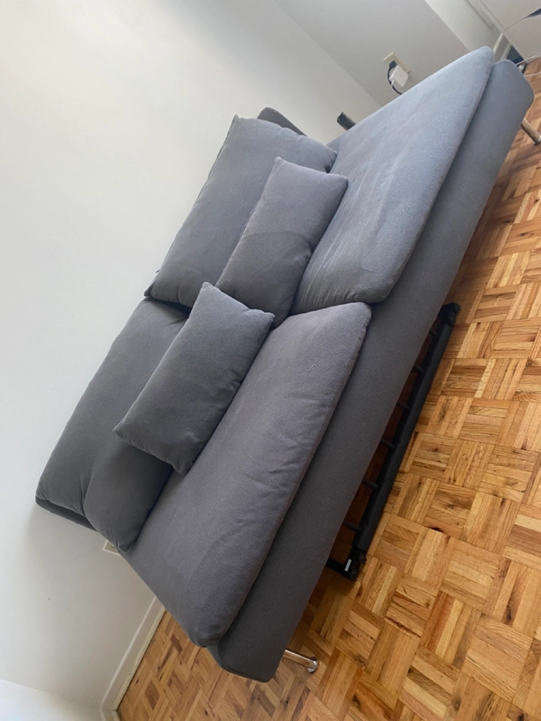 Comfortable futon sofa bed. Grey fabric upholstery. Includes throw pillows. Metal legs.