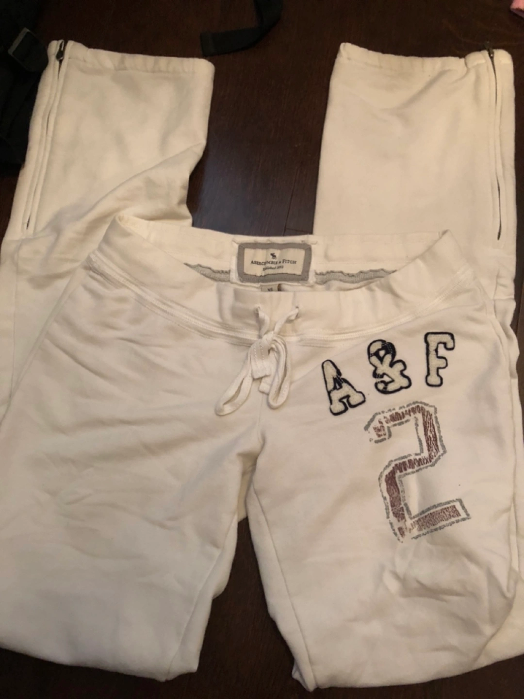 A pair of white sweatpants. Drawstring waist, with a logo and the number 2 on one leg. Zippers at the ankle. These sweatpants are the perfect loungewear for those relaxed days at home.