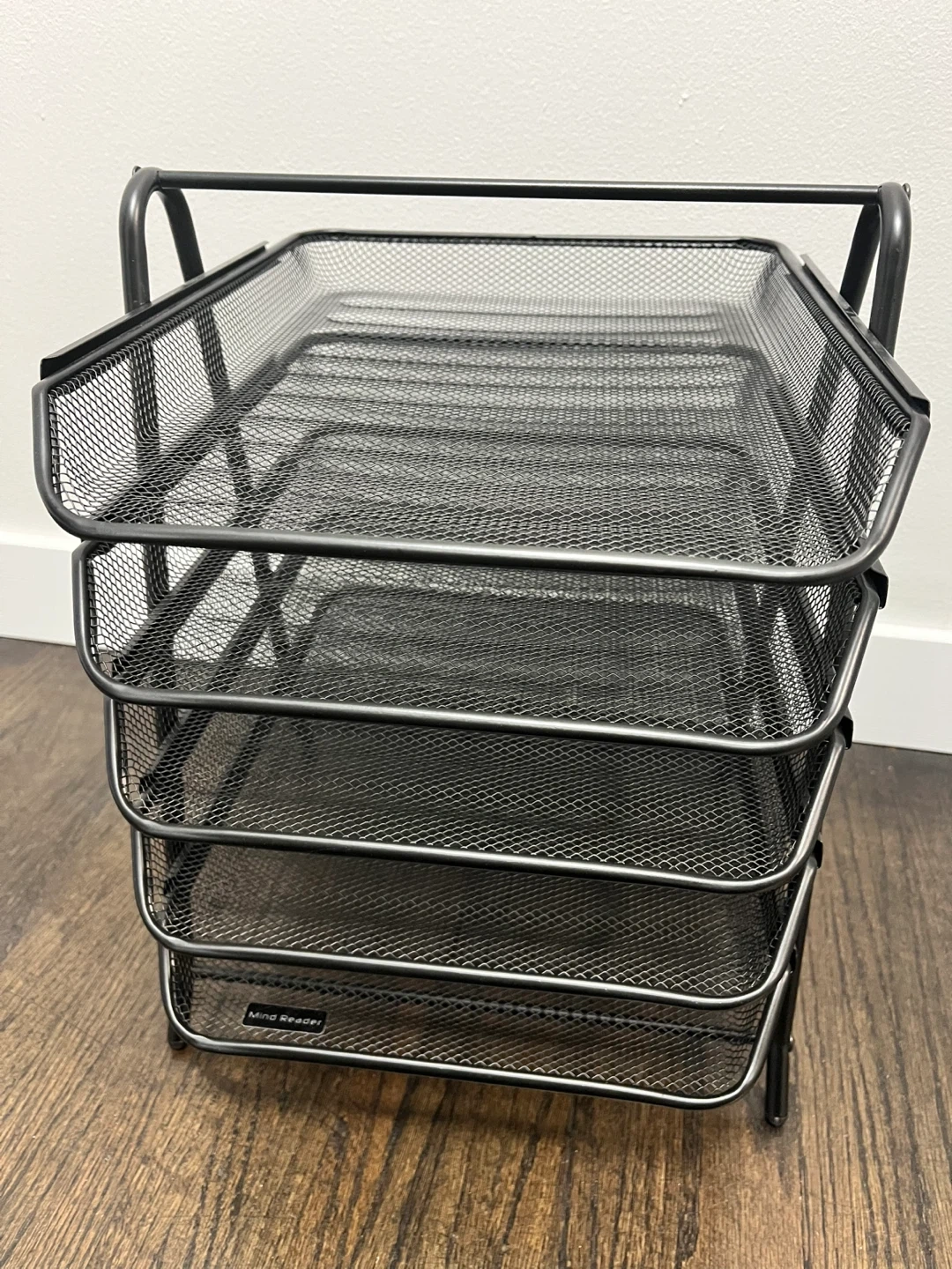 This black metal mesh desk organizer has five tiers for sorting papers and files. It's made of mesh metal. This tray is great for keeping your workspace tidy.