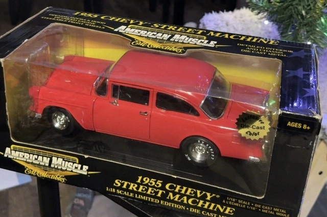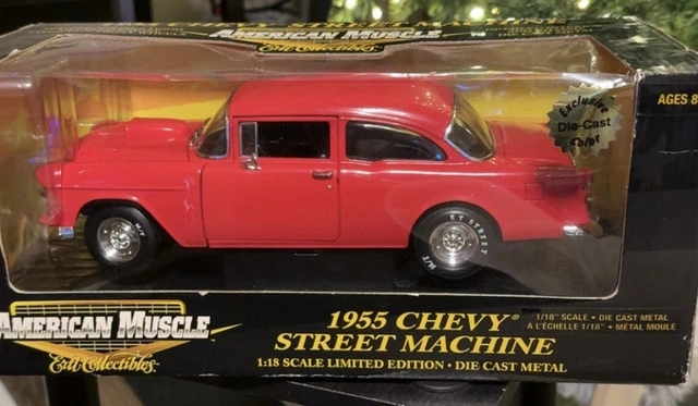 This is a mint condition, 1:18 scale, die-cast 1955 Chevy Street Machine by American Muscle Ertl Collectibles. In its original packaging, making it a great addition to any die-cast car collection.