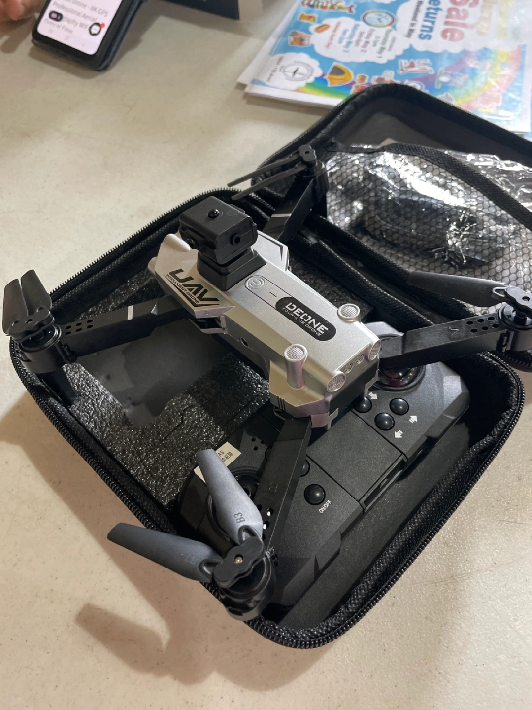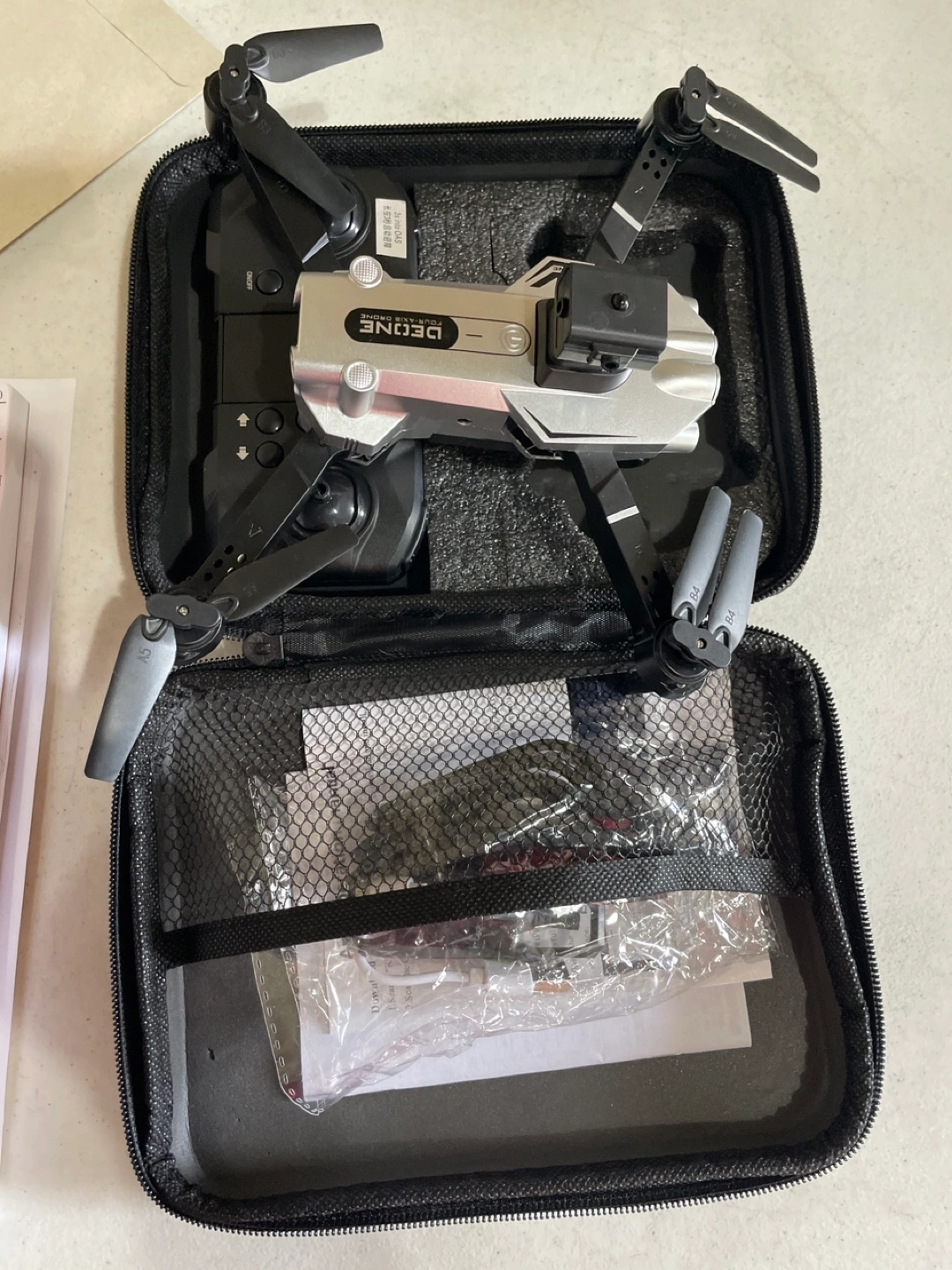 Foldable drone, comes with controller and carrying case. Includes extra propellers. Great for beginners.