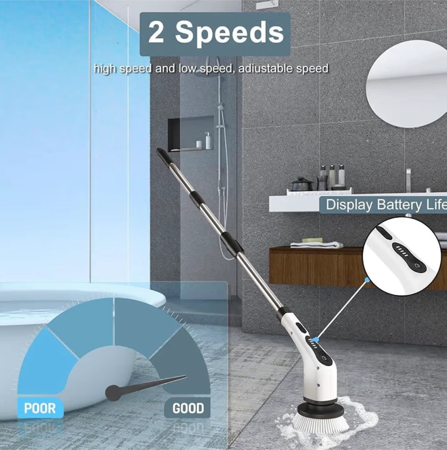 2 Adjustable Speeds: The waterproof bathroom cleaning brush offers two different speeds—daily cleaning and deep cleaning—with just one click, you can choose the cleaning style that best suits your needs.