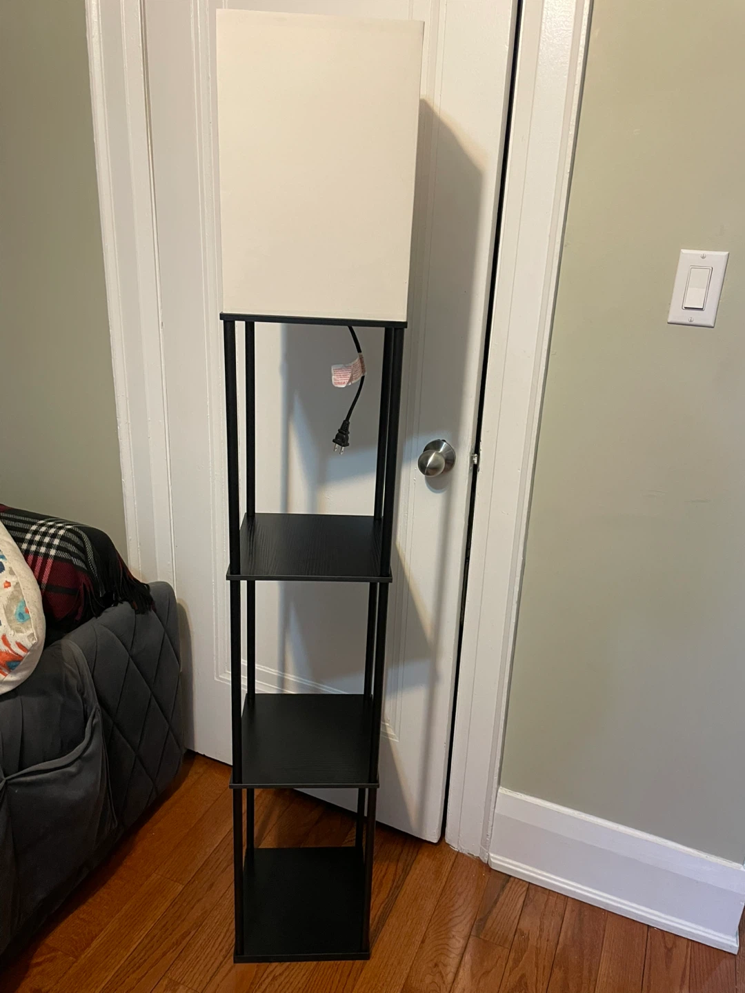 This is a floor lamp with a built-in shelving unit. It's black with a cream-coloured lampshade. The shelves offer extra storage space.