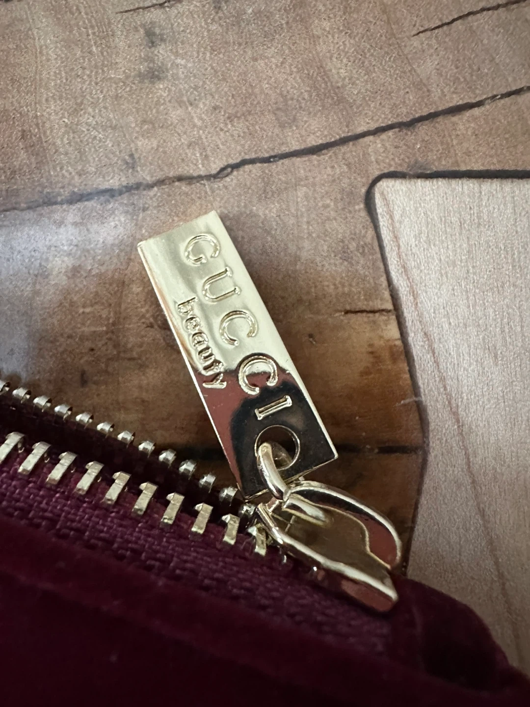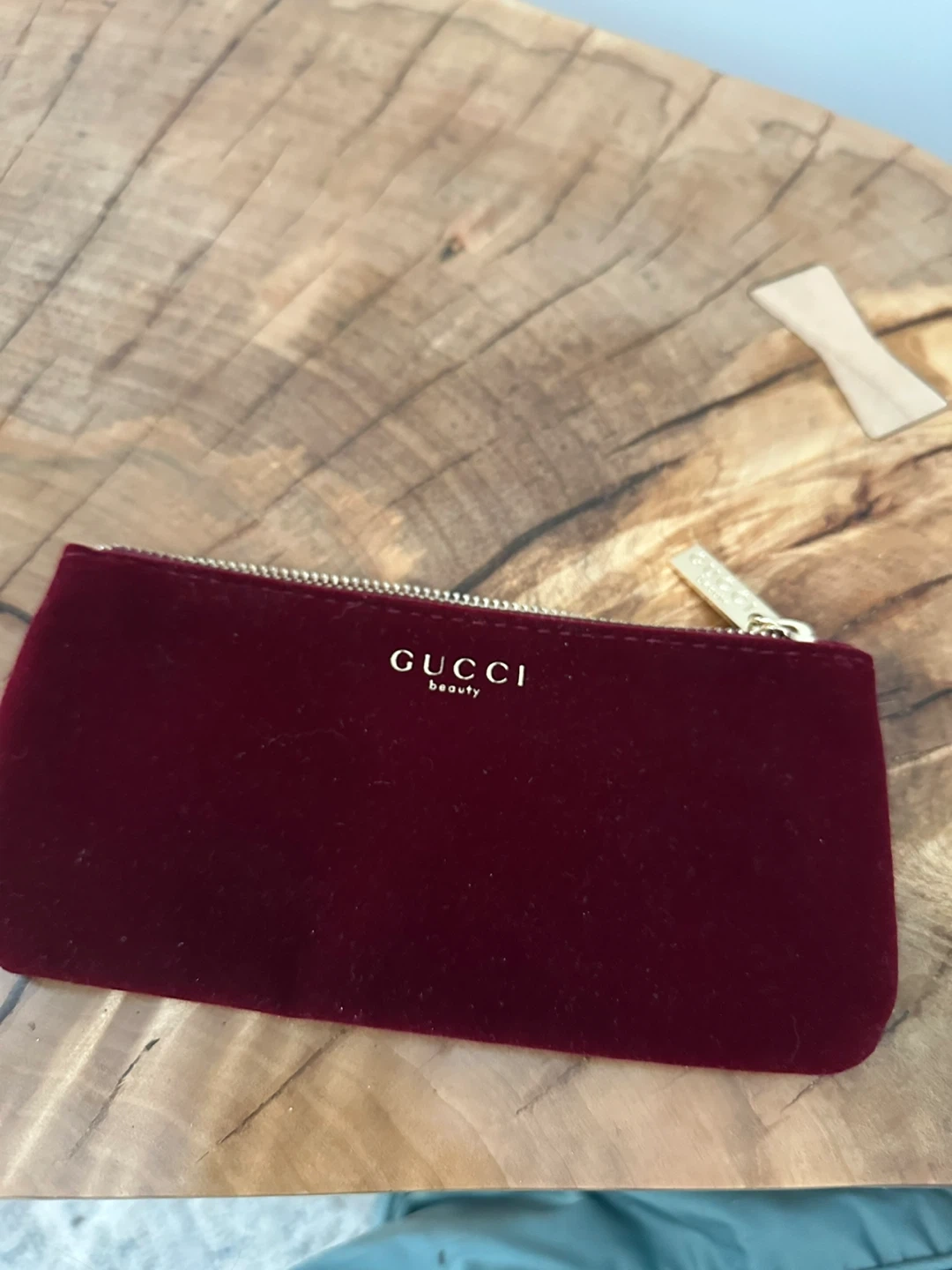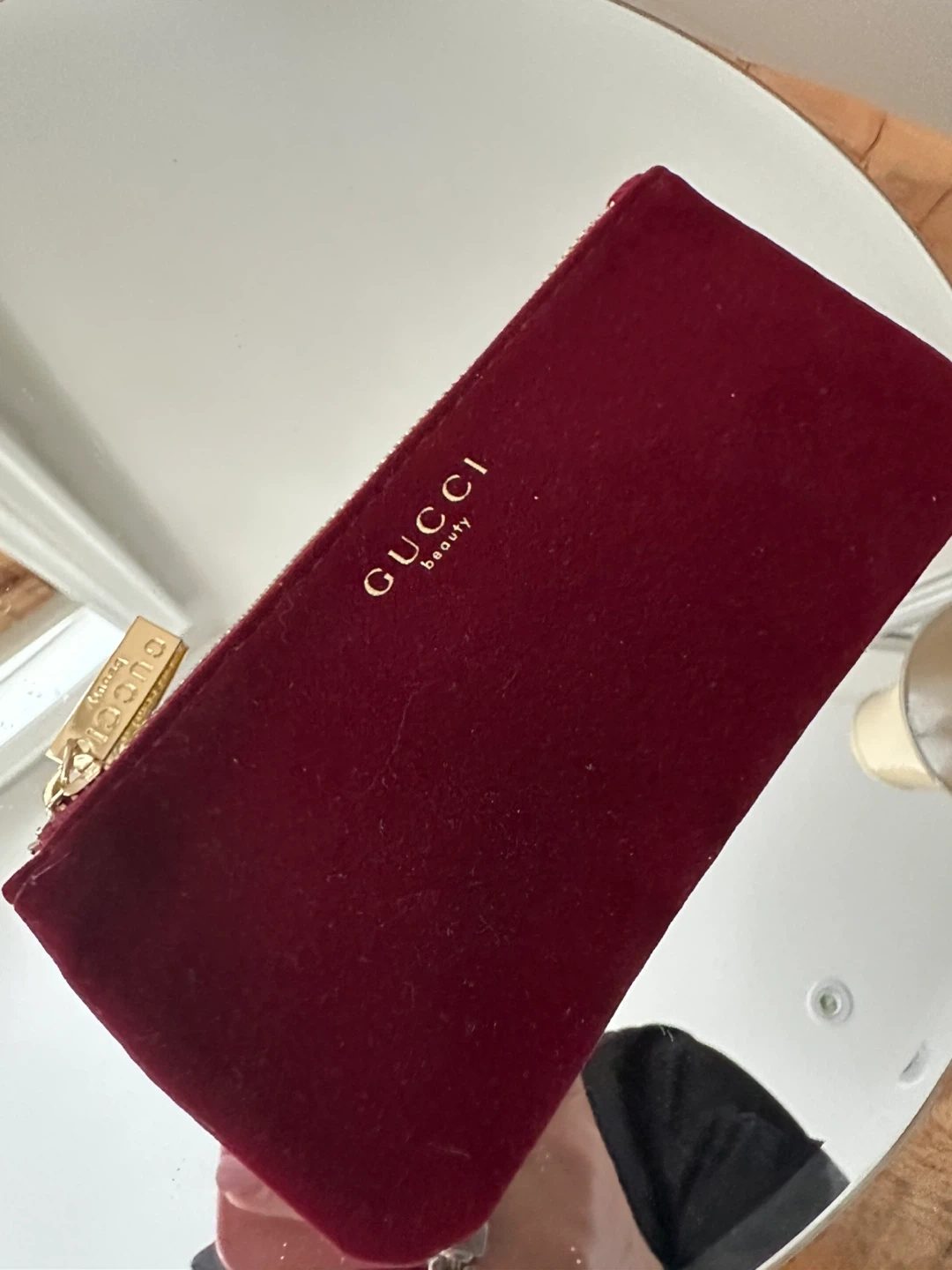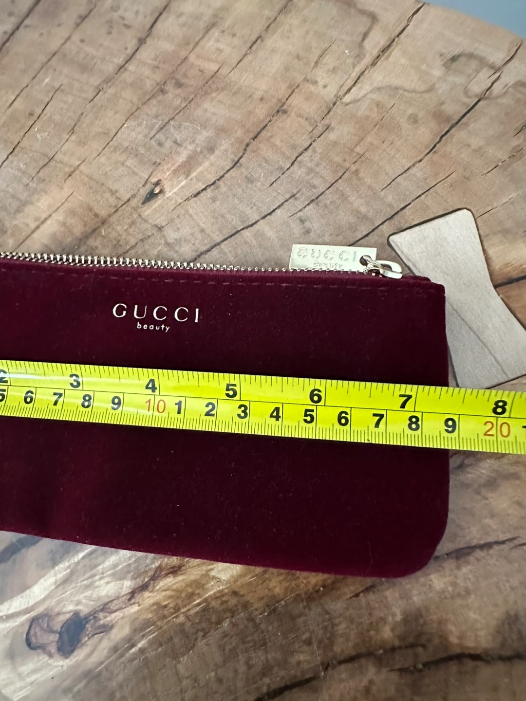 This is a burgundy velvet pouch from Gucci Beauty. It's perfect for storing makeup or small essentials. It measures approximately 8 inches long and 4 inches tall.