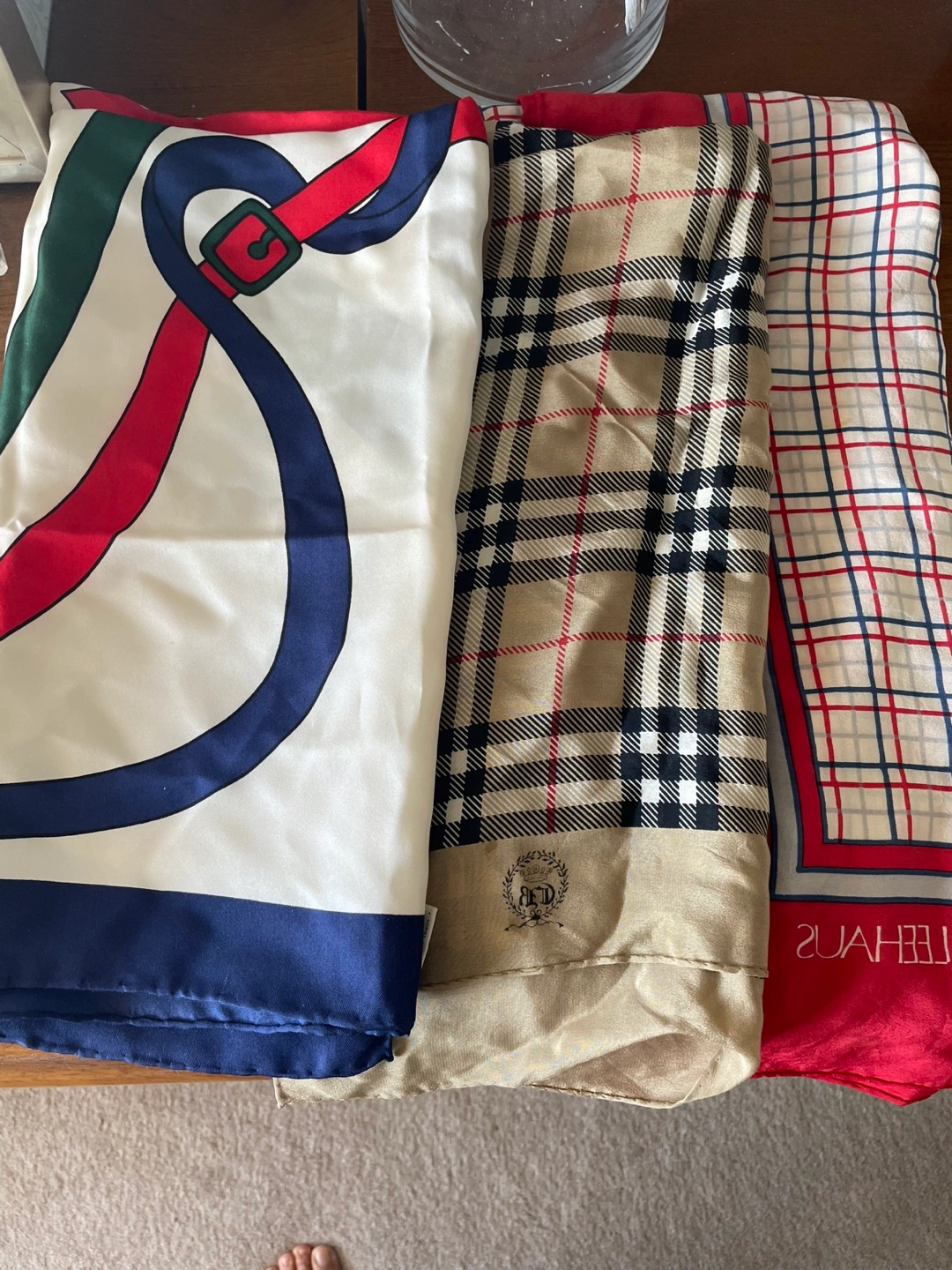 Selling a bundle of assorted scarves in good condition. There's a Burberry-style plaid scarf and two other patterned scarves. Perfect for adding a touch of style to any outfit!