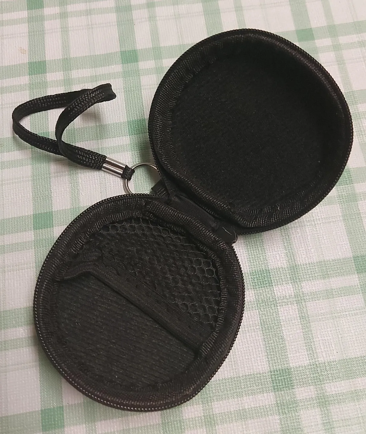 It's a black zippered carrying case. It has a mesh pocket inside and a lanyard attached. Great for small electronics or accessories!