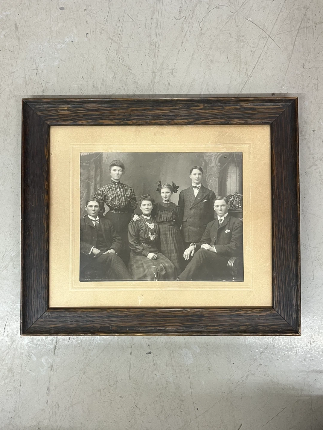 Vintage framed black and white family portrait featuring six individuals. The photo is housed in a dark wood frame with a light-coloured mat. It's a wonderful glimpse into the past!