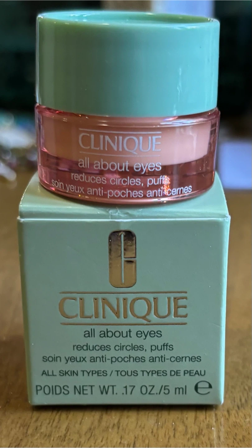 Clinique All About Eyes eye cream is now available! This formula reduces circles and puffs around the eyes. It's suitable for all skin types. 0.17 oz / 5 ml.