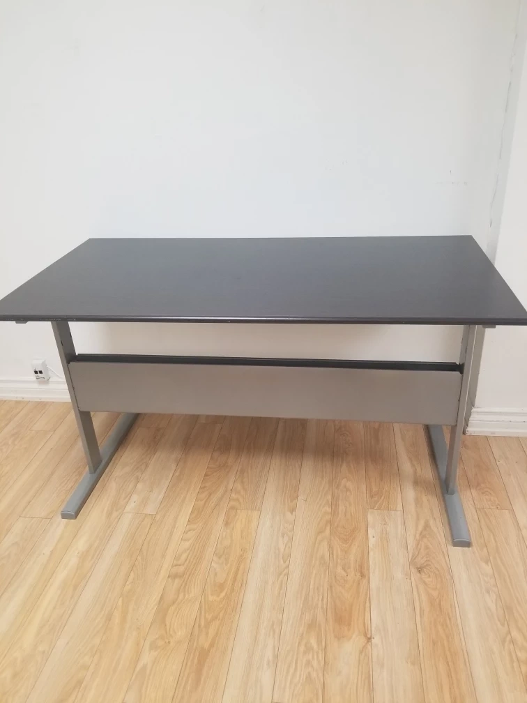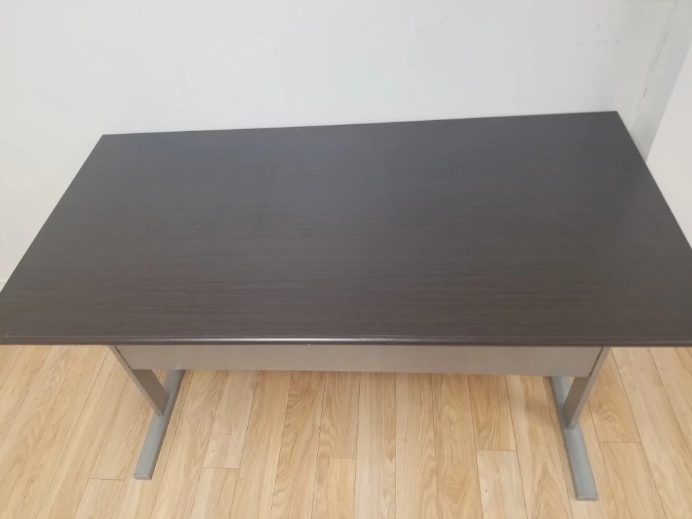 Simple office desk. Dark brown top, silver-grey legs. Good condition. Durable and functional. Perfect for home or office use.
