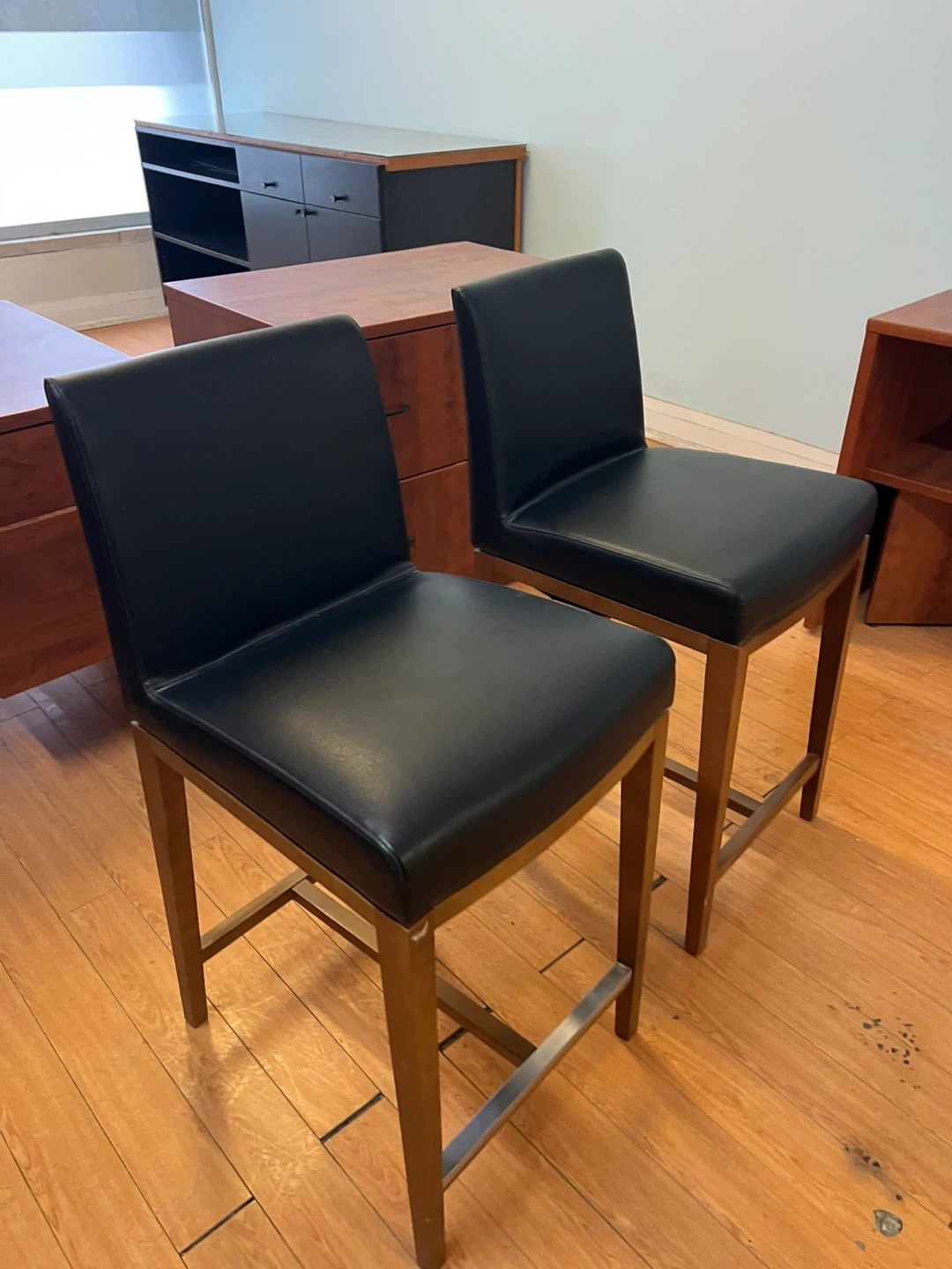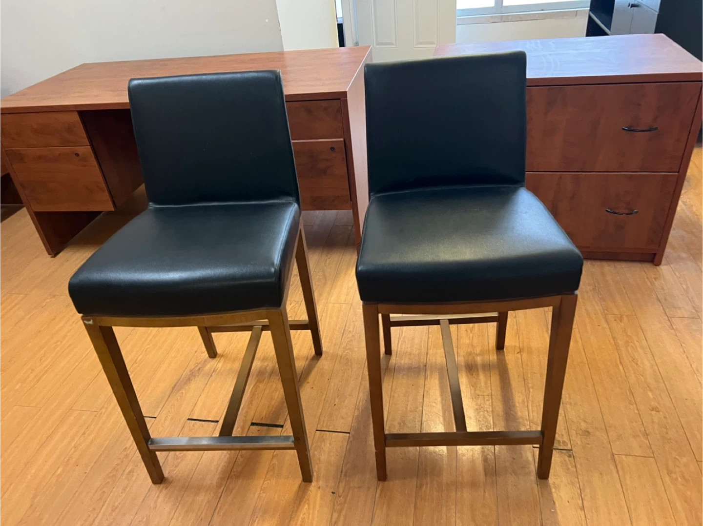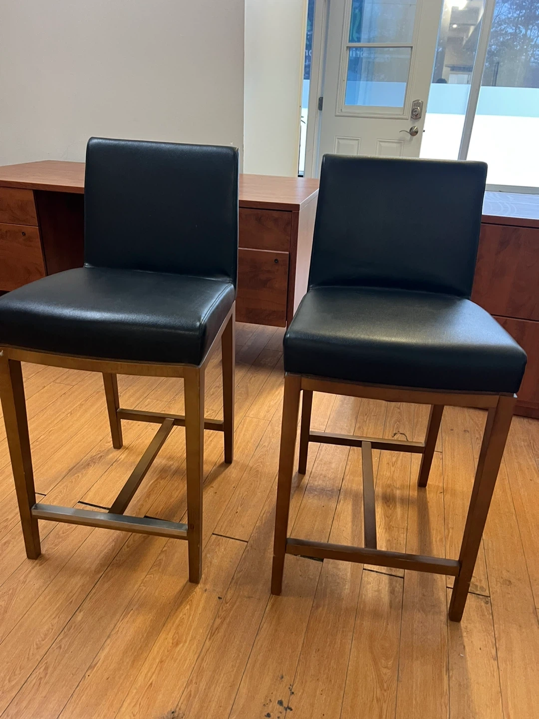 Selling a used pair of black bar stools with faux leather upholstery. They feature wooden legs and a metal footrest. Great for a kitchen island or home bar!