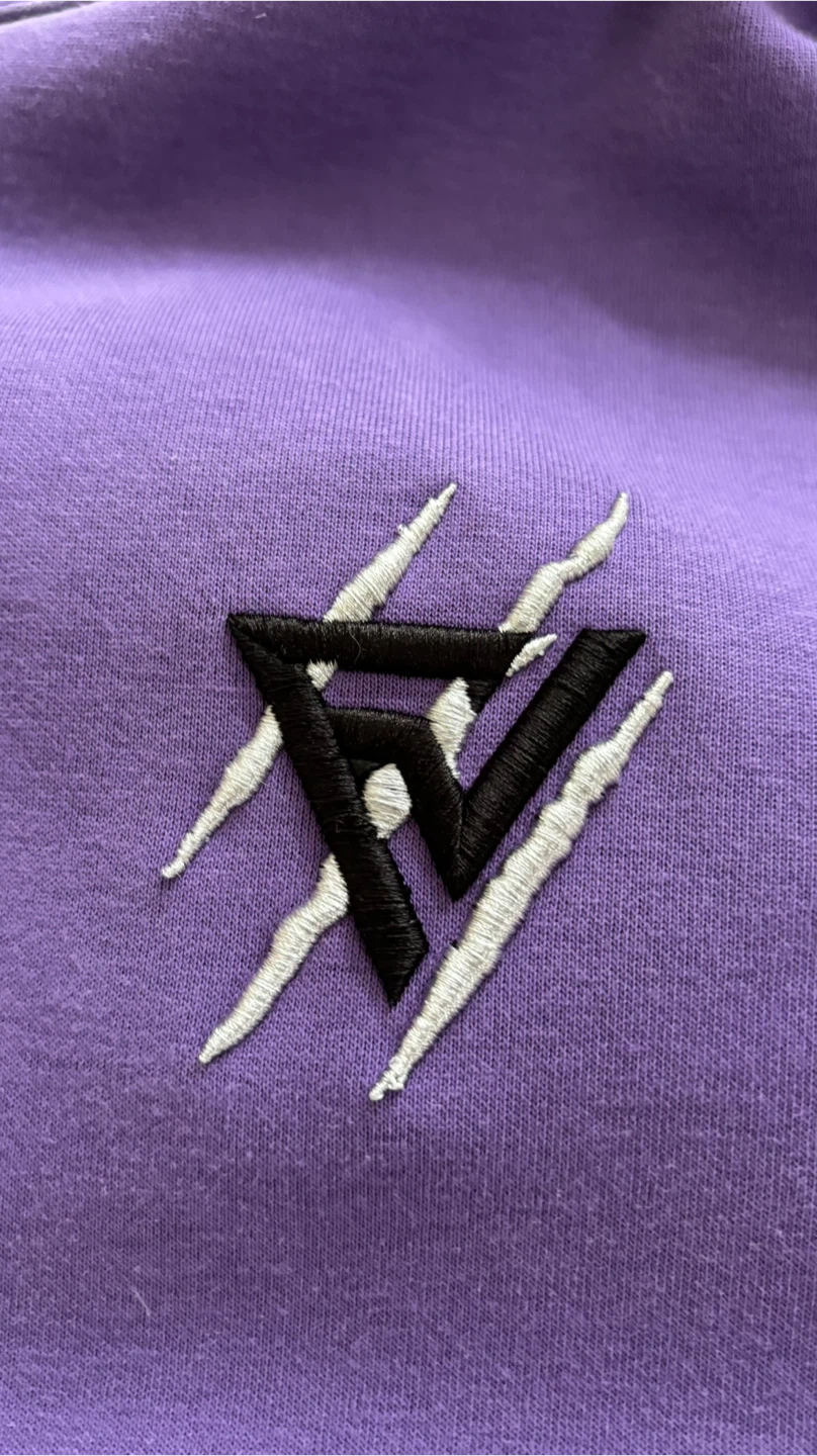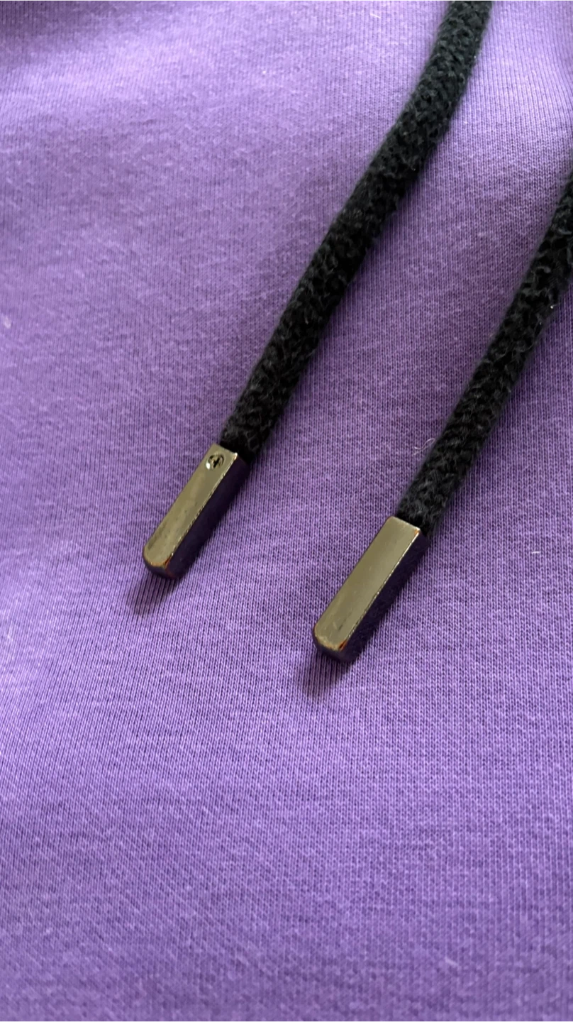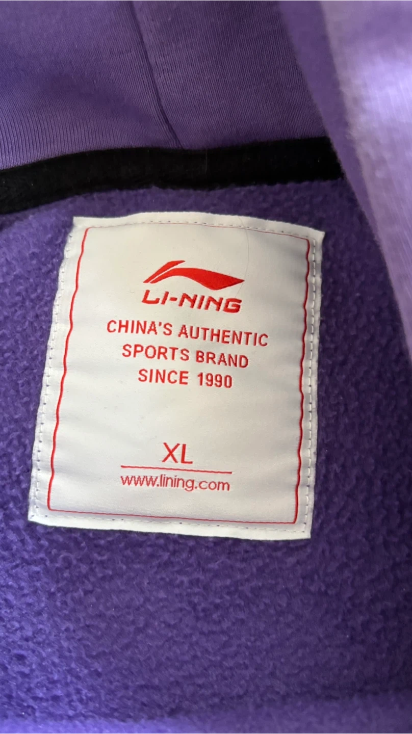 This is a Li-Ning VANILEET hoodie in purple. It features embroidered graphics on the front and a large "23" graphic on the back. The hood has black drawstrings with metal tips. Made from a soft fabric for comfort.