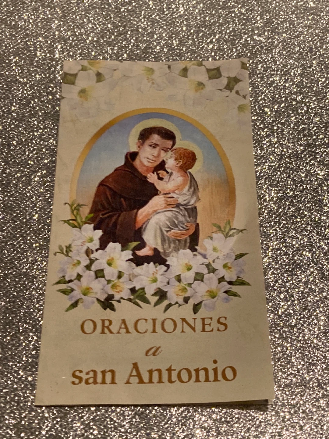 This is a prayer booklet featuring Saint Anthony holding the child Jesus. It has floral accents and reads 'Oraciones a San Antonio'.