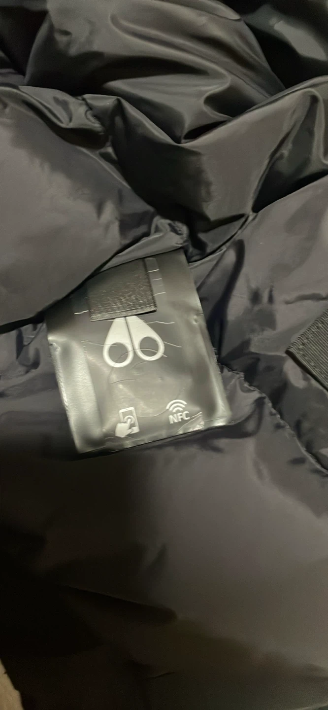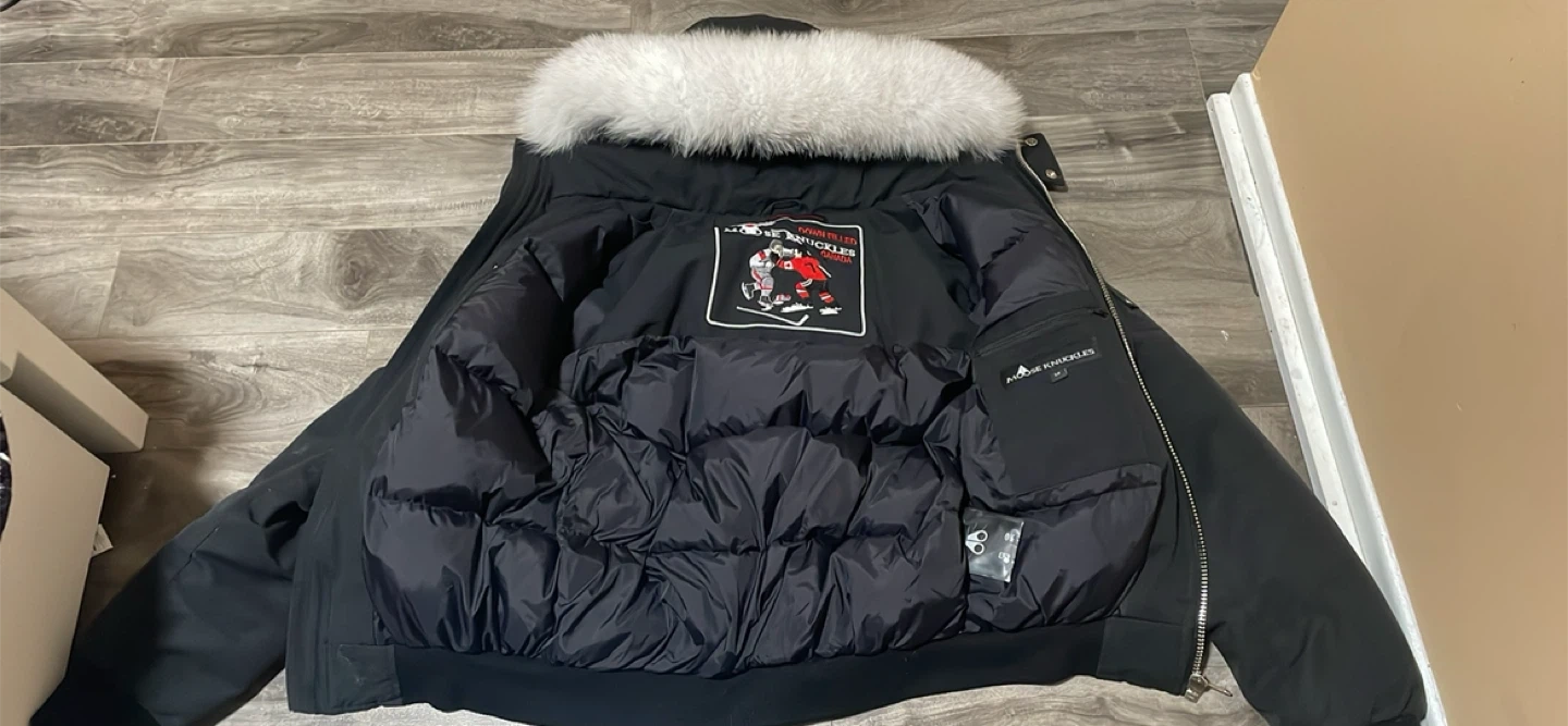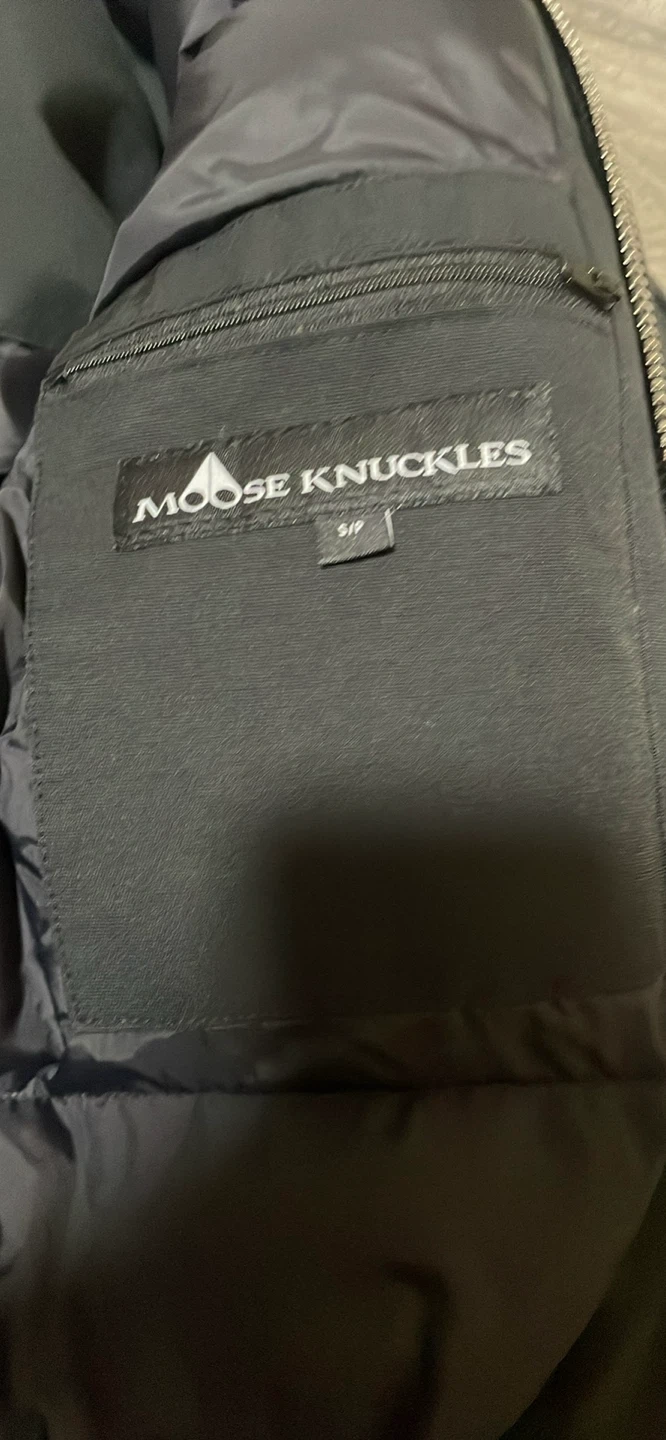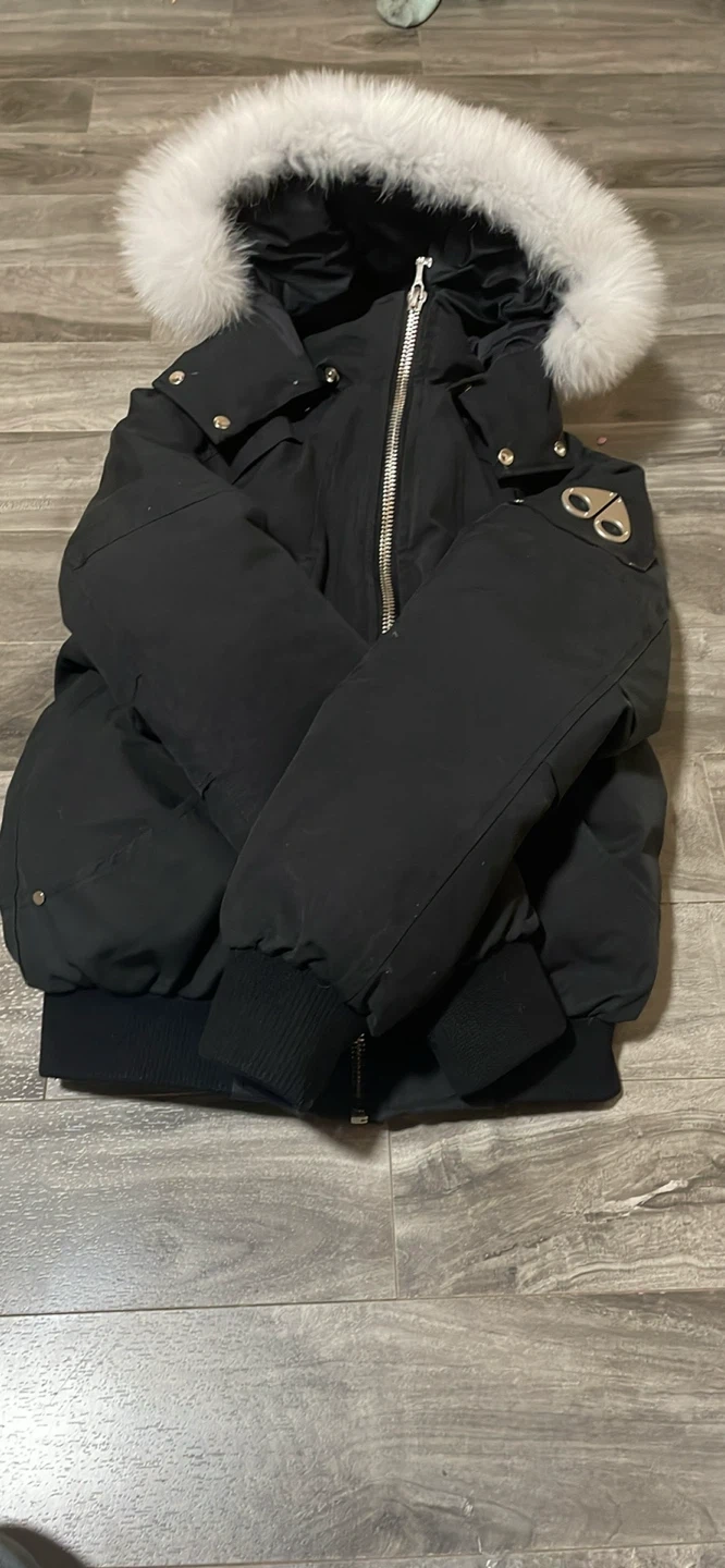 Moose Knuckles jacket in black. Size S White far lined hood and hockey pick up ajax